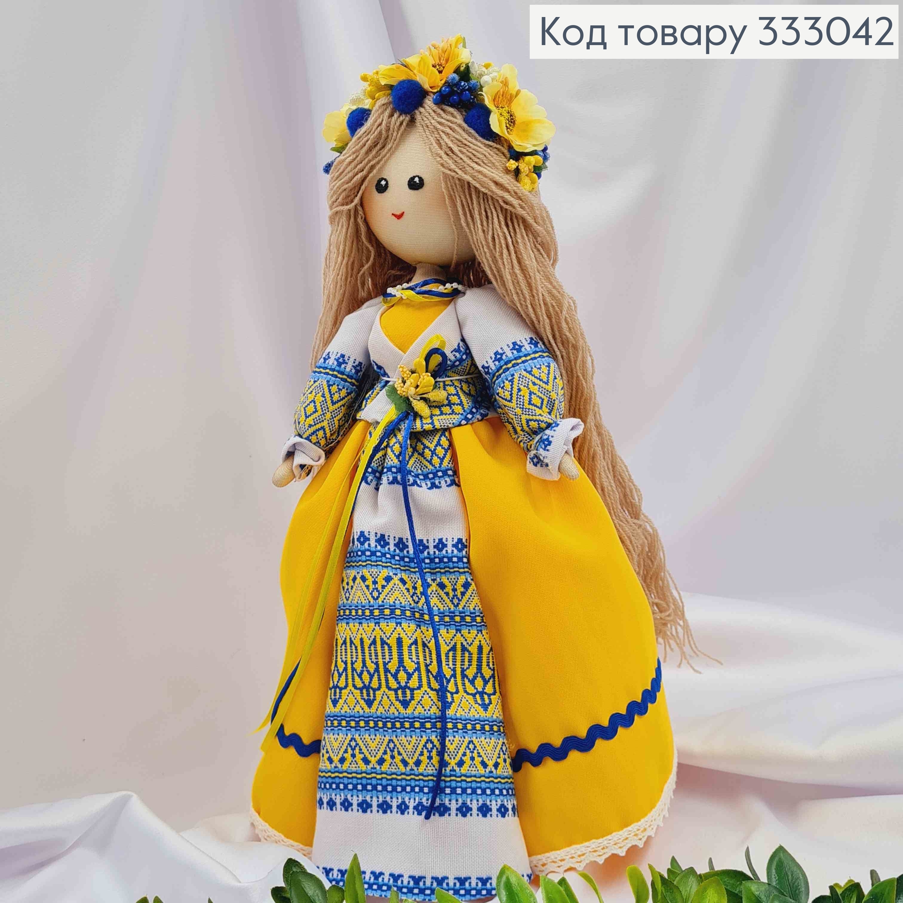 КУКЛА РУЧНОЙ РАБОТЫ в национальном украинском костюме: Ярко-желтое платье с голубыми и белыми этническими узорами, дополненное венком на голове, символизирует украинскую культуру.