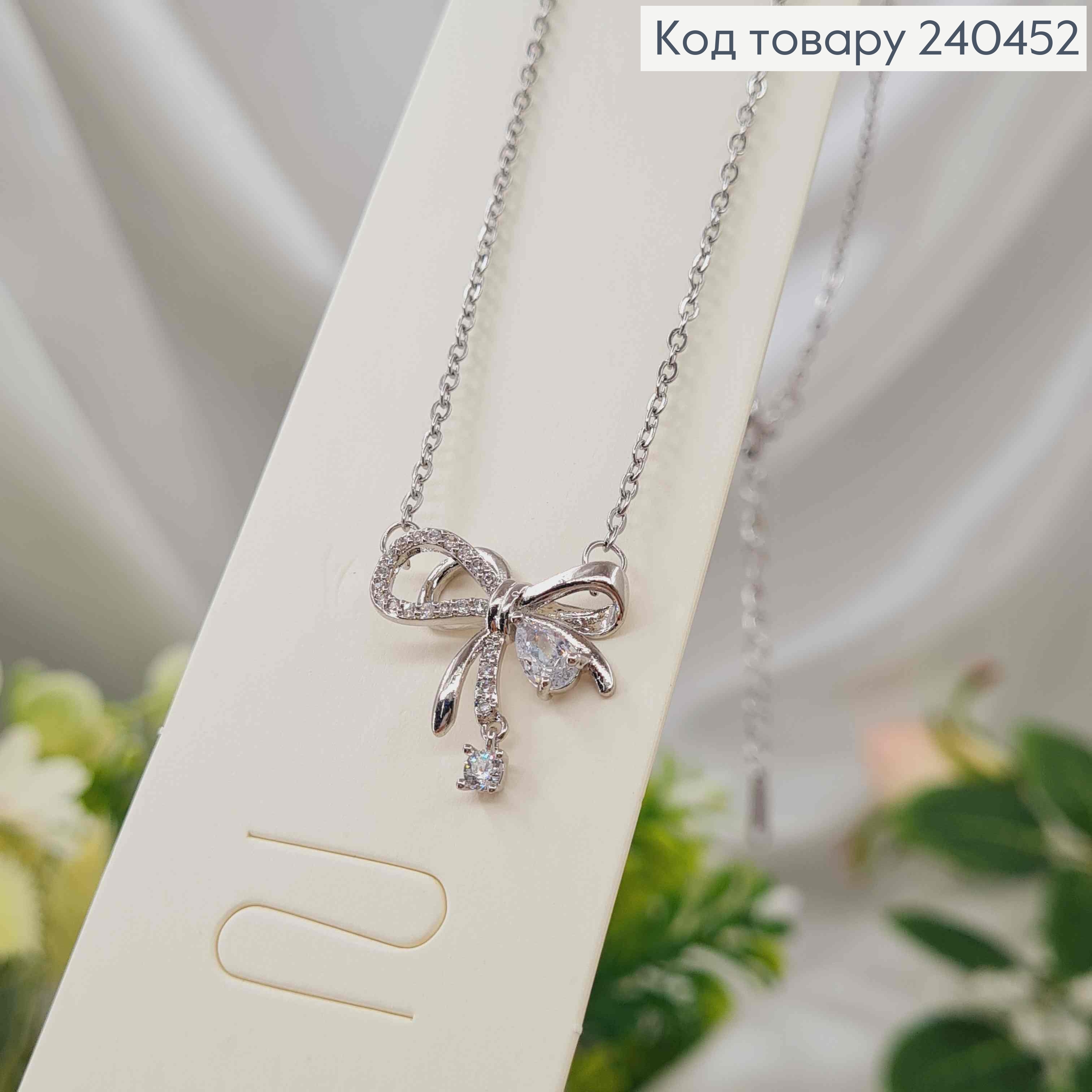 Цепочка серебряного цвета, с подвеской Бантиком, в камешках, 42+5см, сталь Stainless Steel