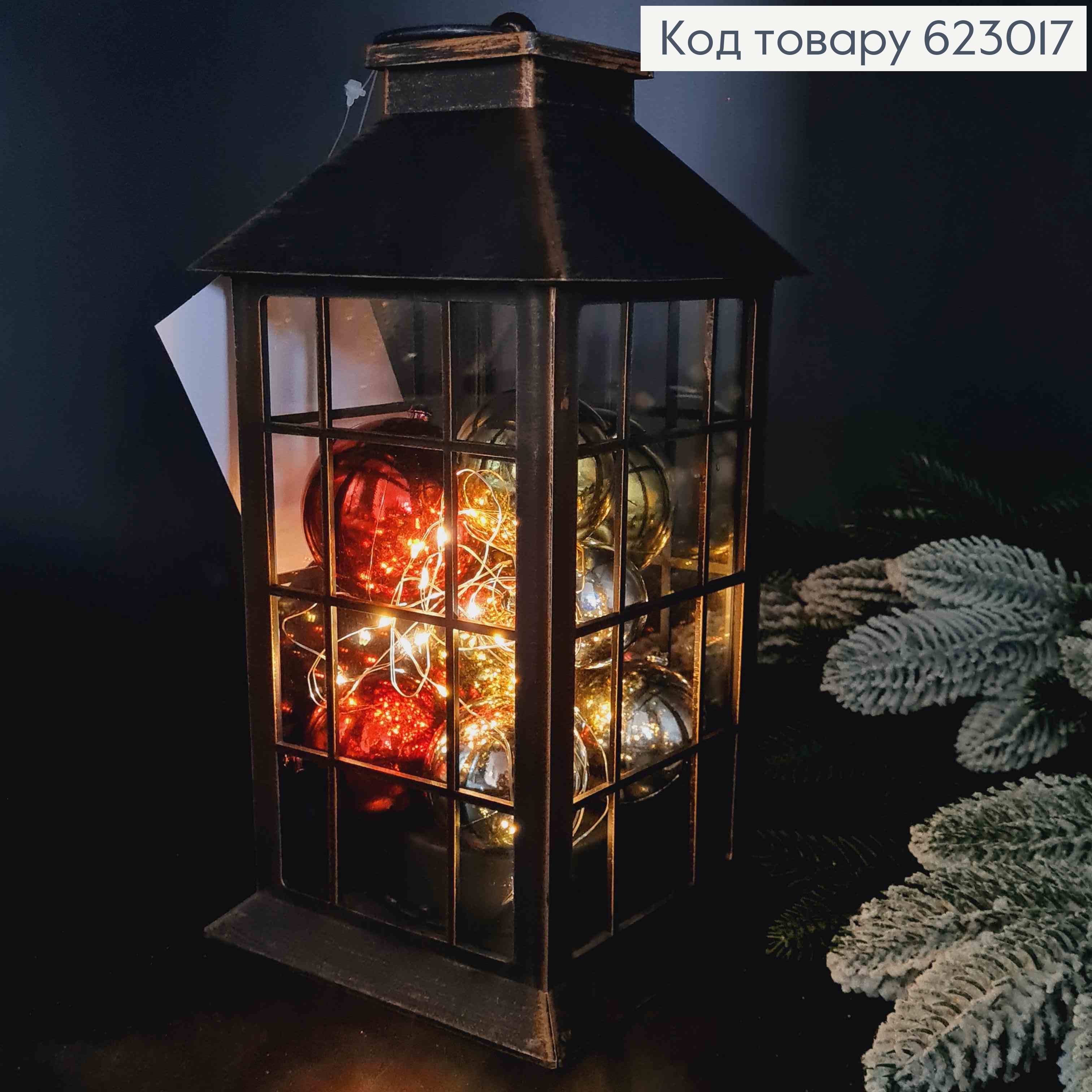 Фонарик скло, Бронза, С новогодними игрушками, на батарейках, 27*13,5см