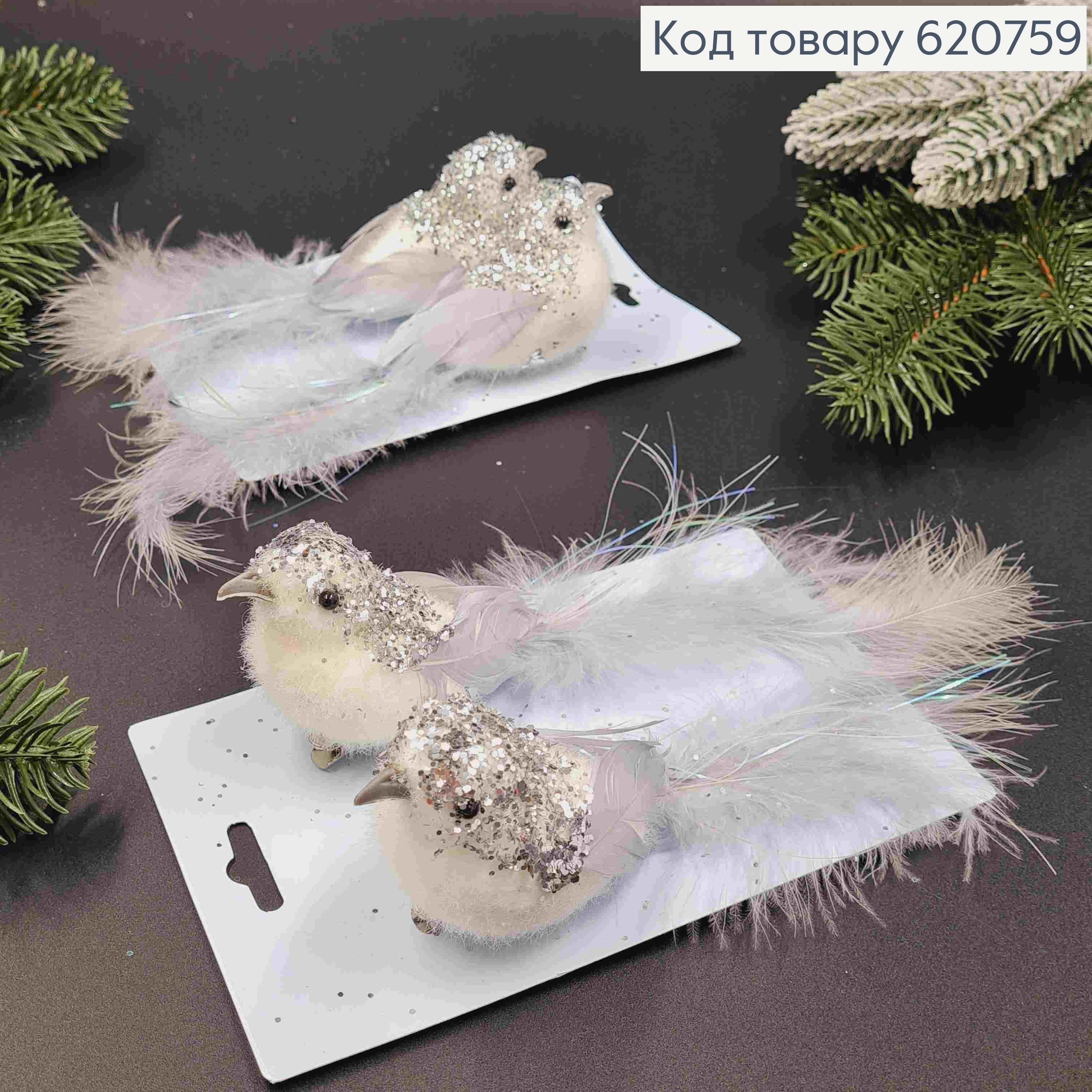 Набор (2шт) : ПТИЦА на заколке, БЕЛОГО цвета+Блеск, 15см, новогодний декор 620758 фото