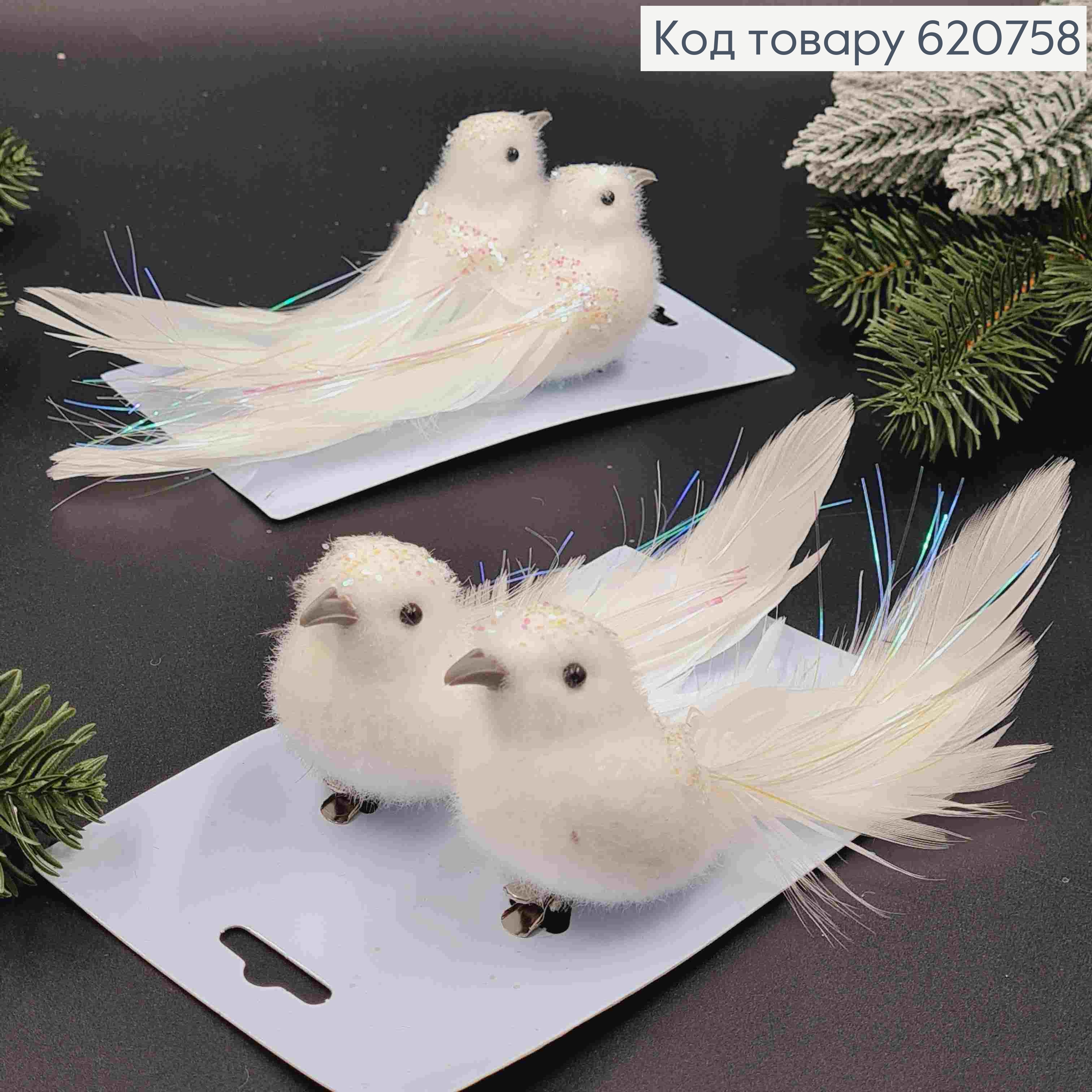 Набор (2шт) : ПТИЦА на заколке, БЕЛОГО цвета+Блеск, 15см, новогодний декор 620758 фото