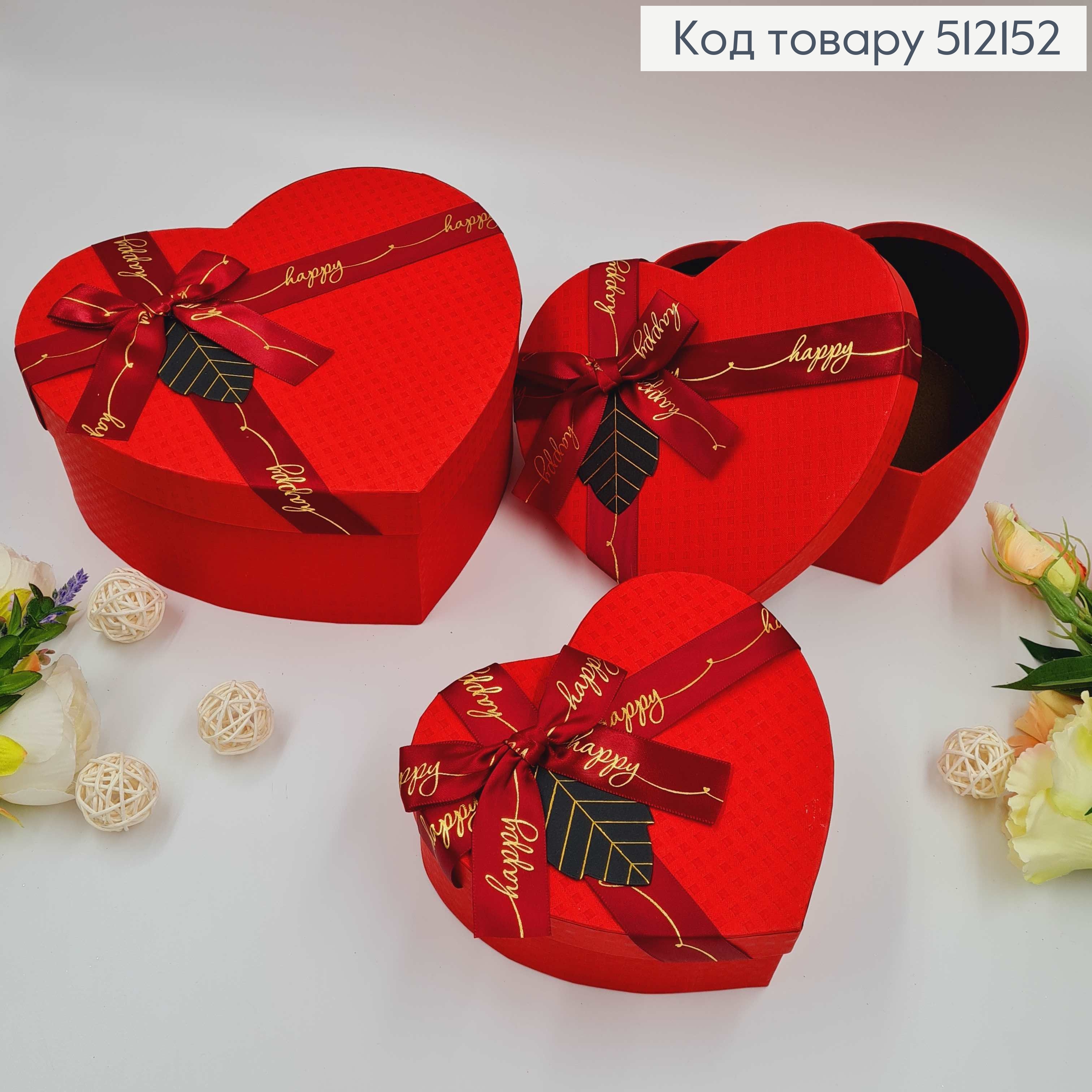 Набор коробок, Сердце, Красные, со лентой "Happy", 3шт(15х13х6см, 18х15х7см, 21х18х9см)
