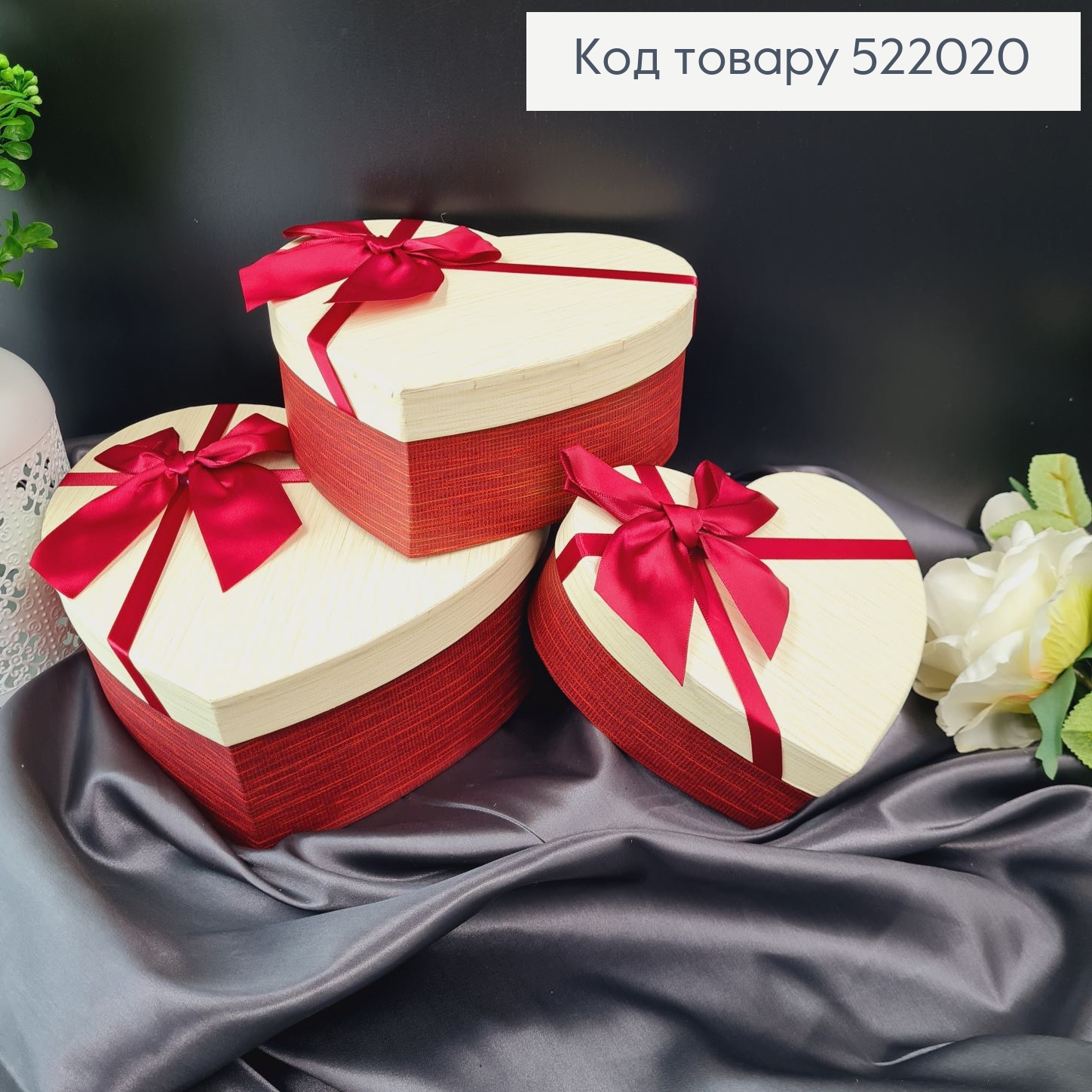 Набор коробок "Сердце" с Белой крышкой и Бордовым бантом 3шт. (14х16х6см, 17х18х7см, 20х21х9см)