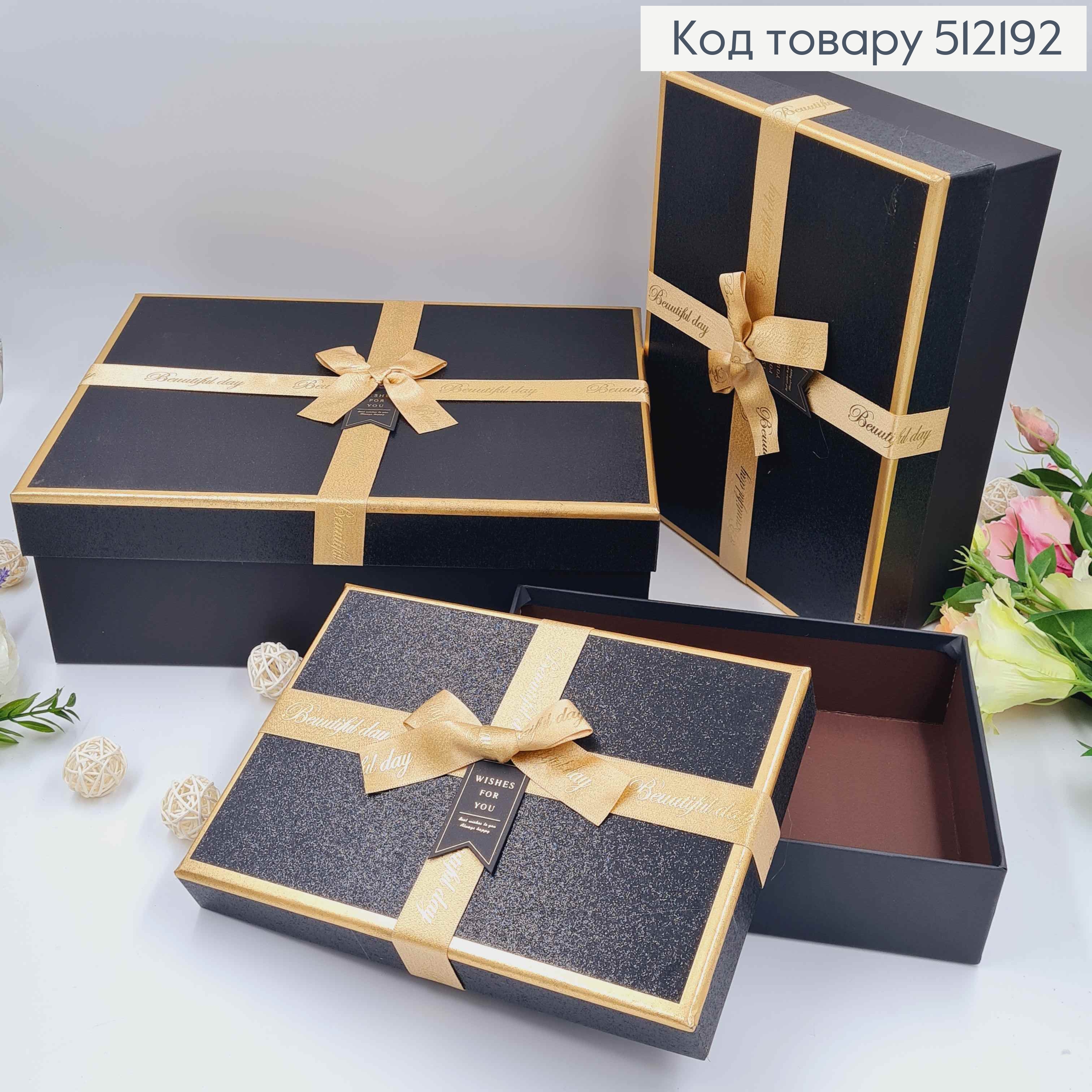 Набор коробок (3шт) "БЛЕСК", прямоугольные ЧЕРНЫЕ с золотой лентой (32*25*11см,28*20*8см,24*16*6см)