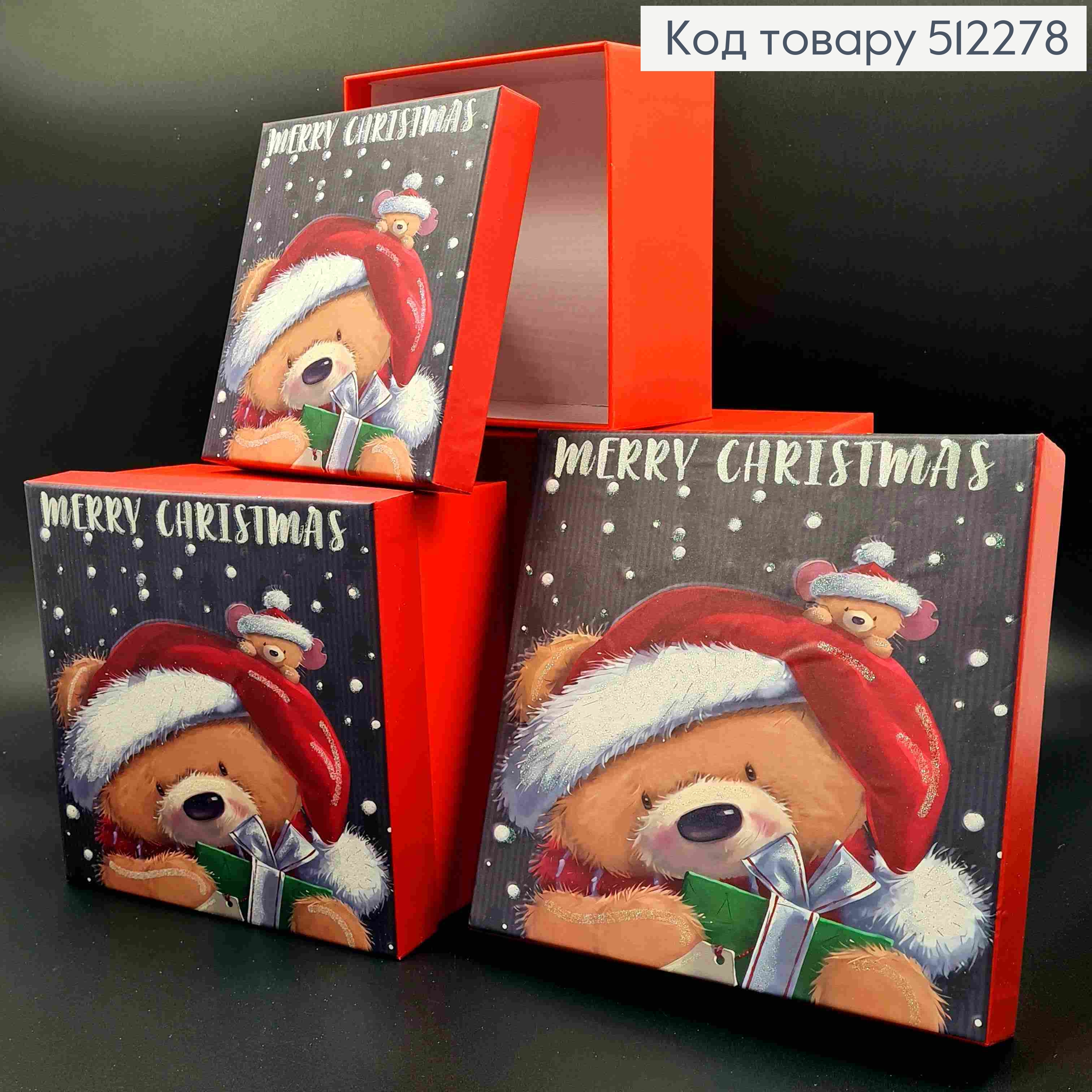 Набор коробок (3шт), квадратная "Merry Christmas" с Мишкой, (20х20х9см, 17,5х17,5х8,5см, 15х15х7см)