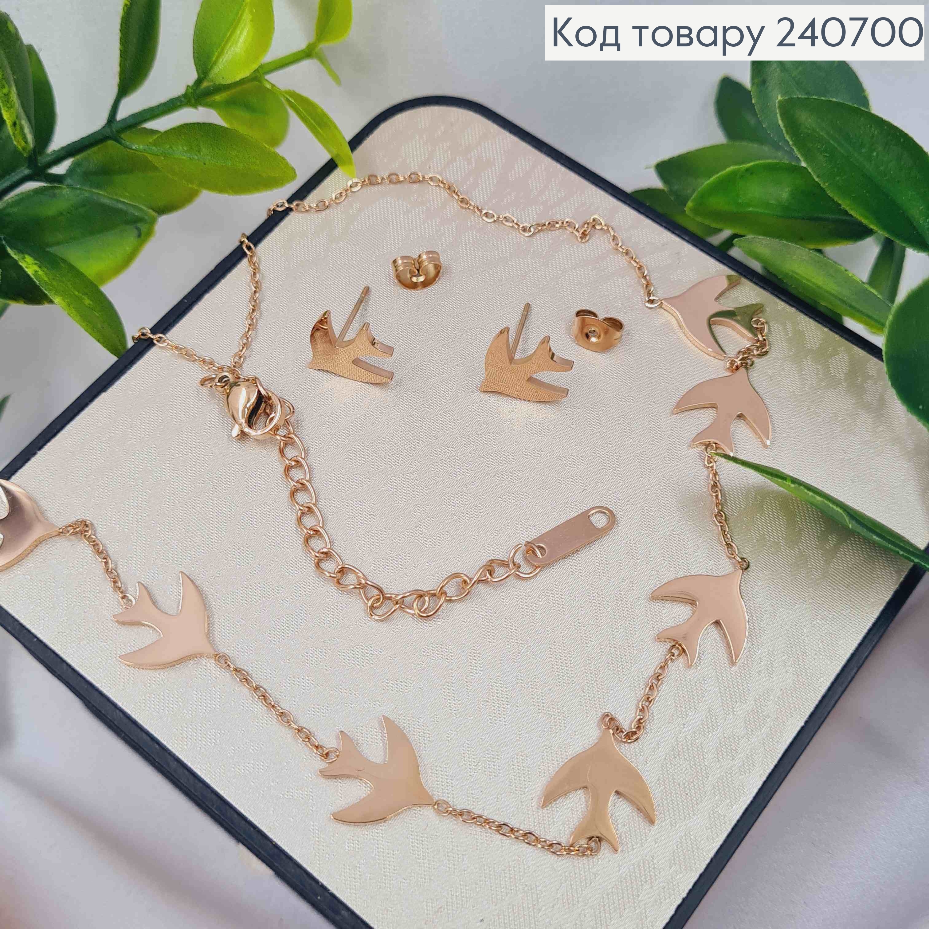 Набор "Ласточки": Цепочка(38+5), Серьги гвоздики(1,2см), Медного цвета, Stainless Steel