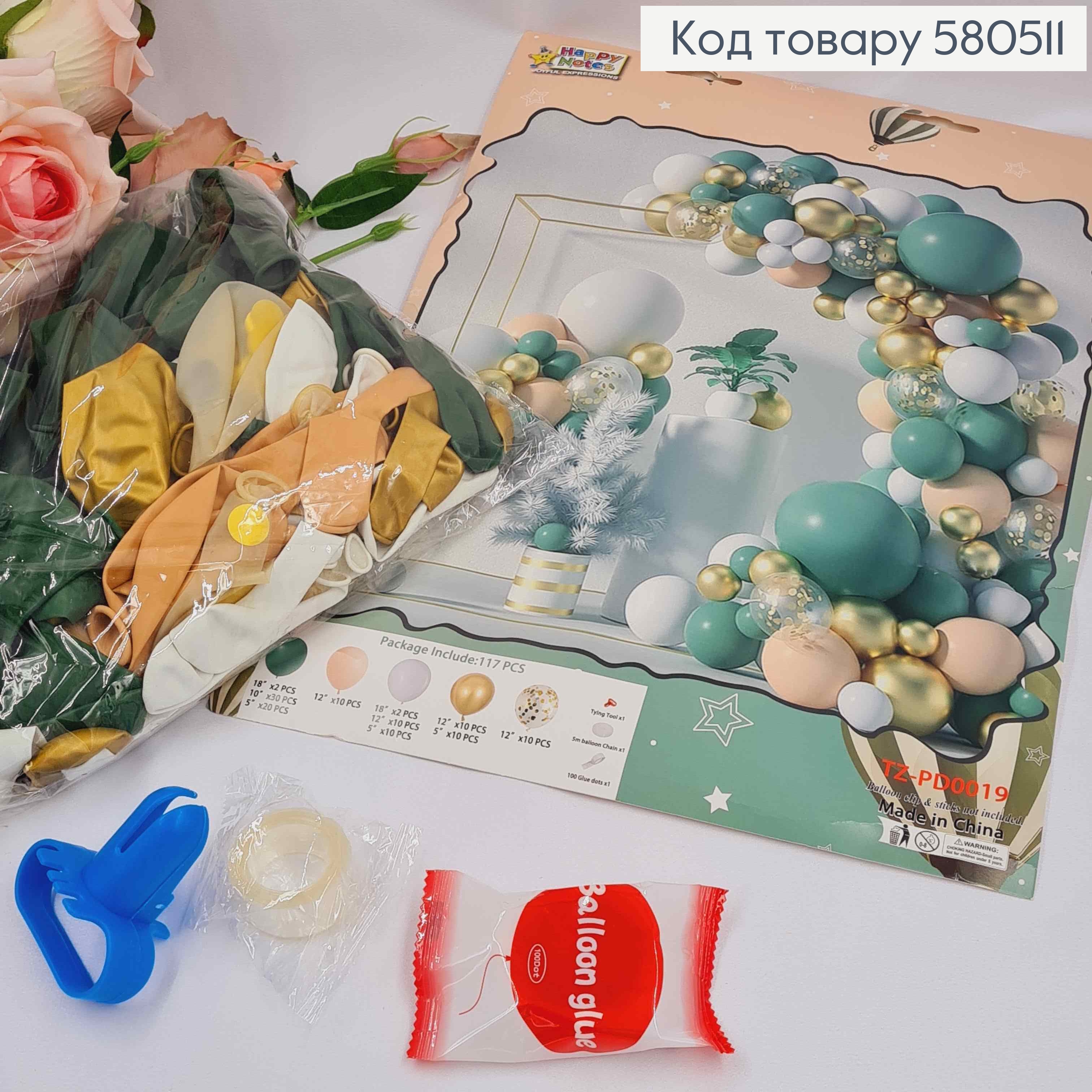 Набор воздушных шаров "Фотозона"ЗЕЛЕНО-БЕЛАЯ-ЗОЛОТАЯ",117шт(18"12",10",5")+2ленты