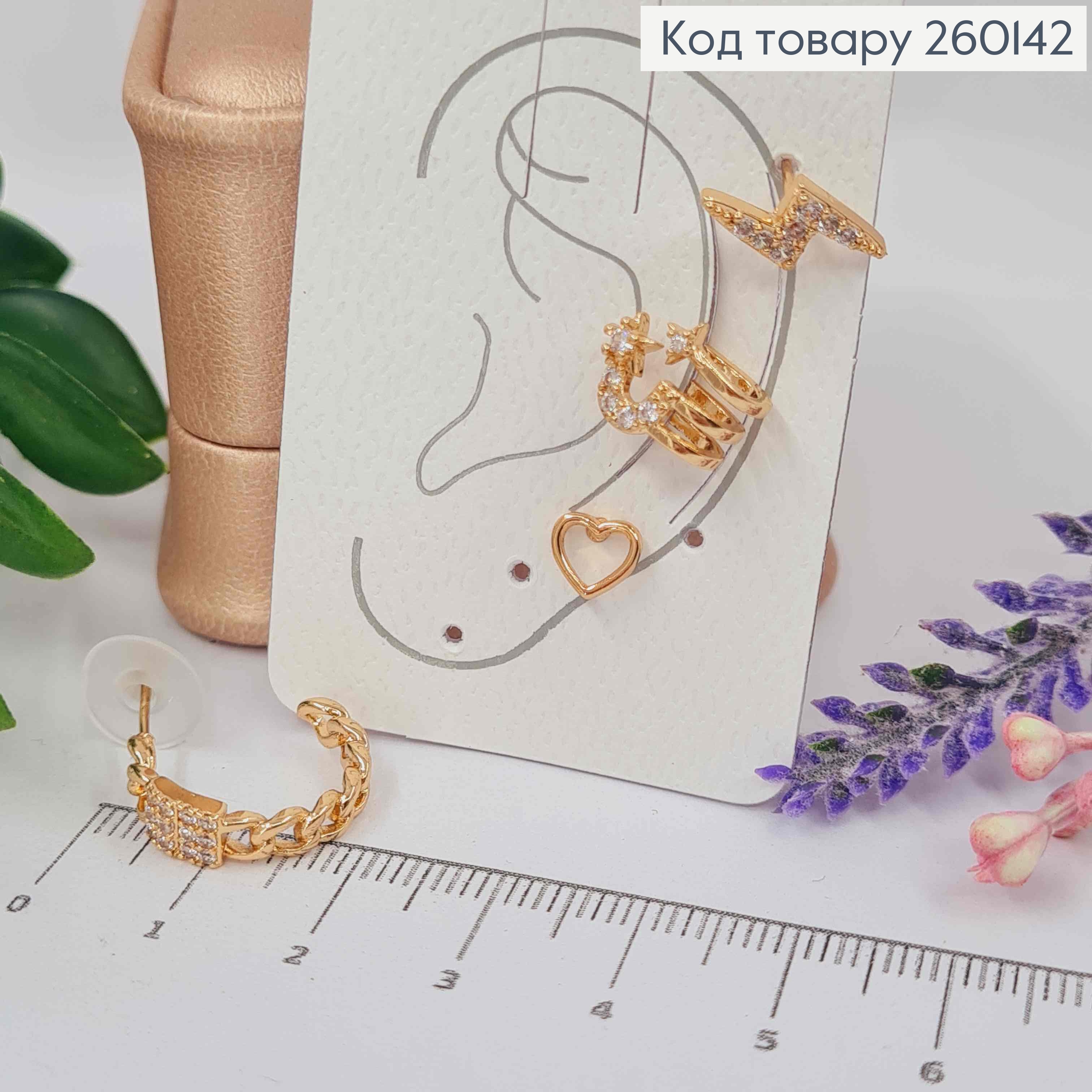 Набор серьг, Кафы(1шт)+Гвозди(3шт), Сердце/Звезды/Цепочка с камешками, Золотого цвета, Сталь