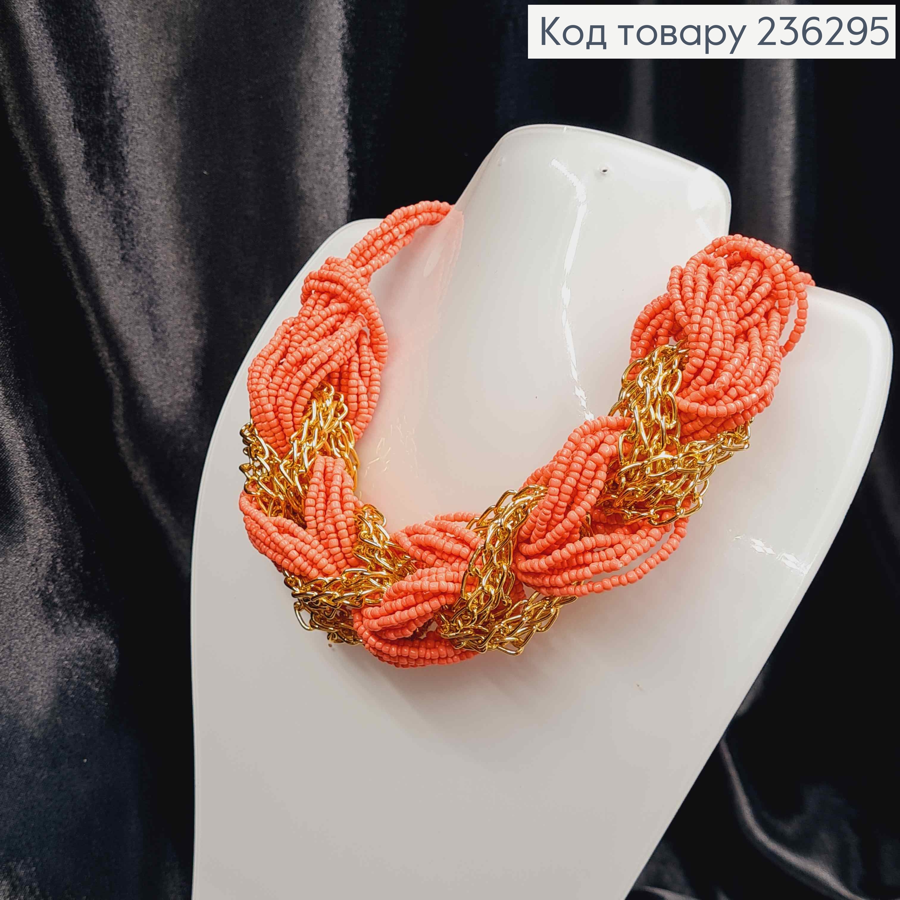 Ожерелье "Косичка" плетеное из бисера кораллового цвета и золотой цепочки, 45+7см