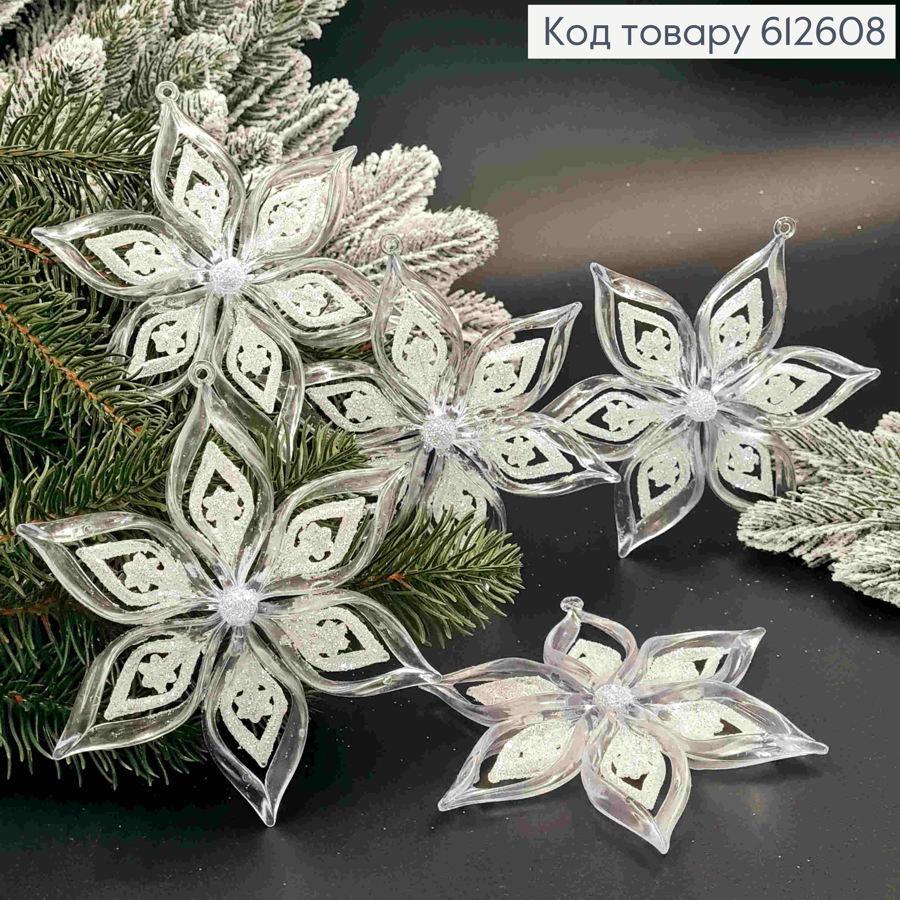 Набор Новогодних фигур, СНЕЖИНКА, пластик, цвет ПРОЗРАЧНЫЙ+БЛЕСК, 5шт/уп, 12см, Украина 612614 фото