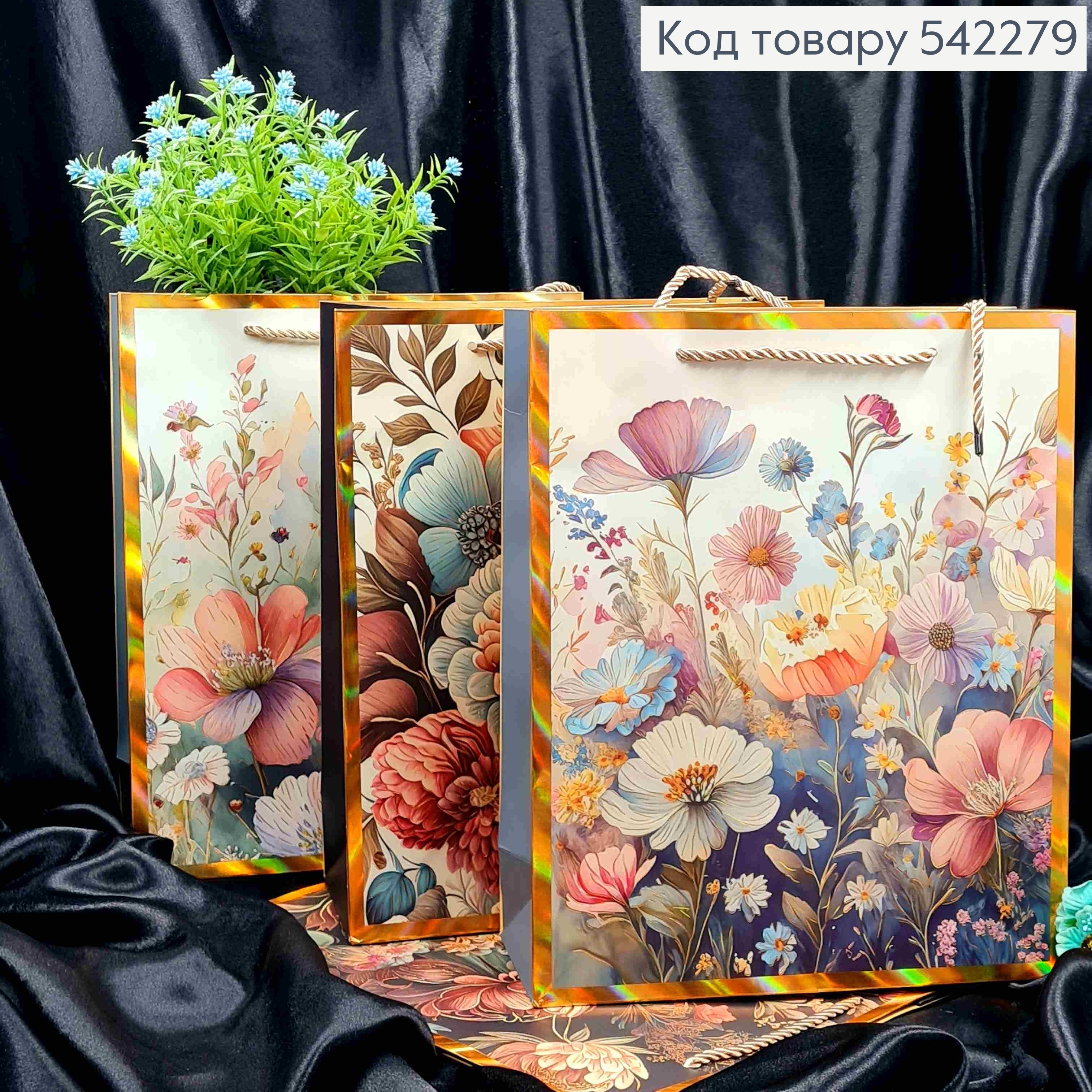 Пакет бумажный с принтом "Полевые Цветы" и Золотой рамкой, 32*26*10см, в ассортименте