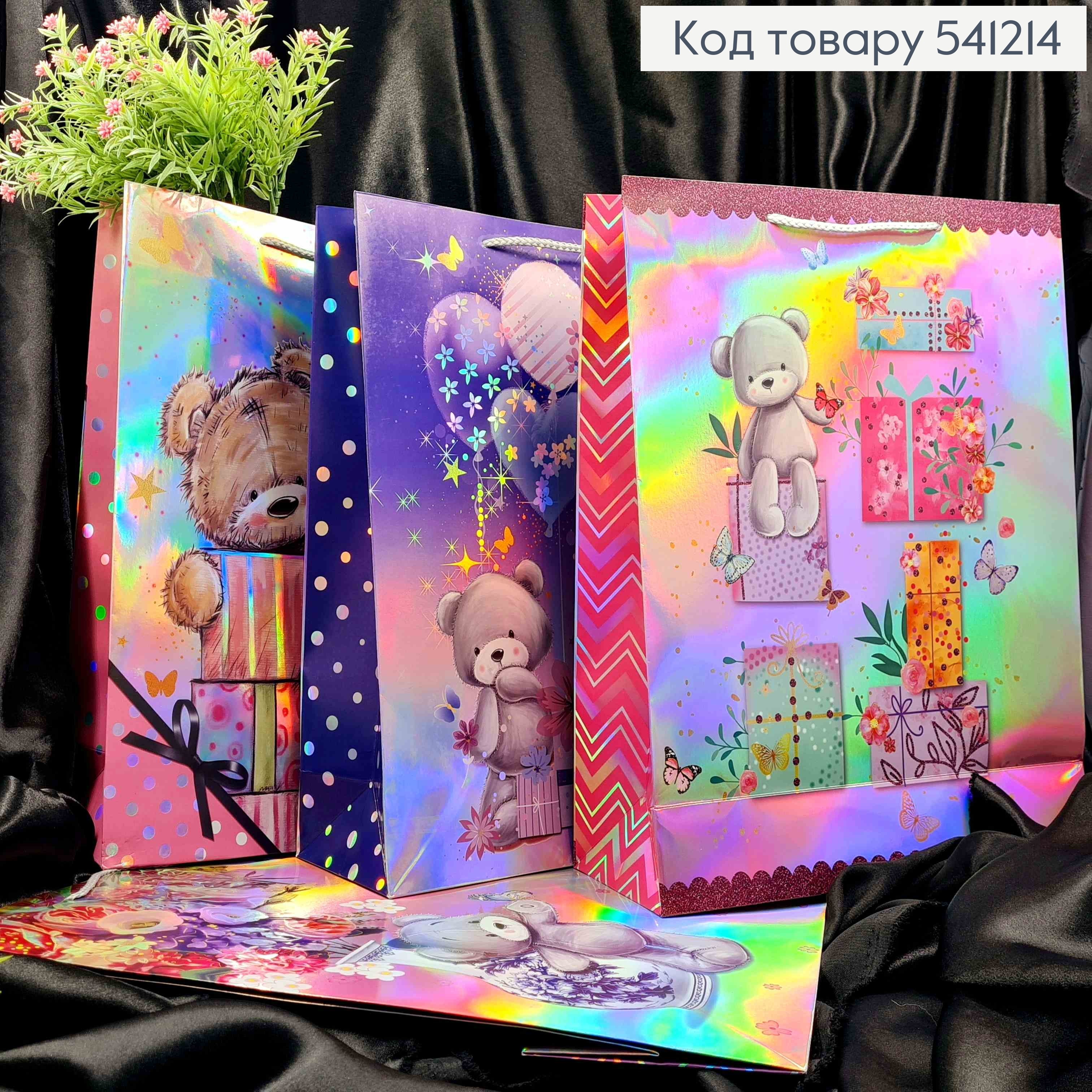 Пакет бумажный с принтом "Мишка с подарками", 42*31*12см, в ассортименте
