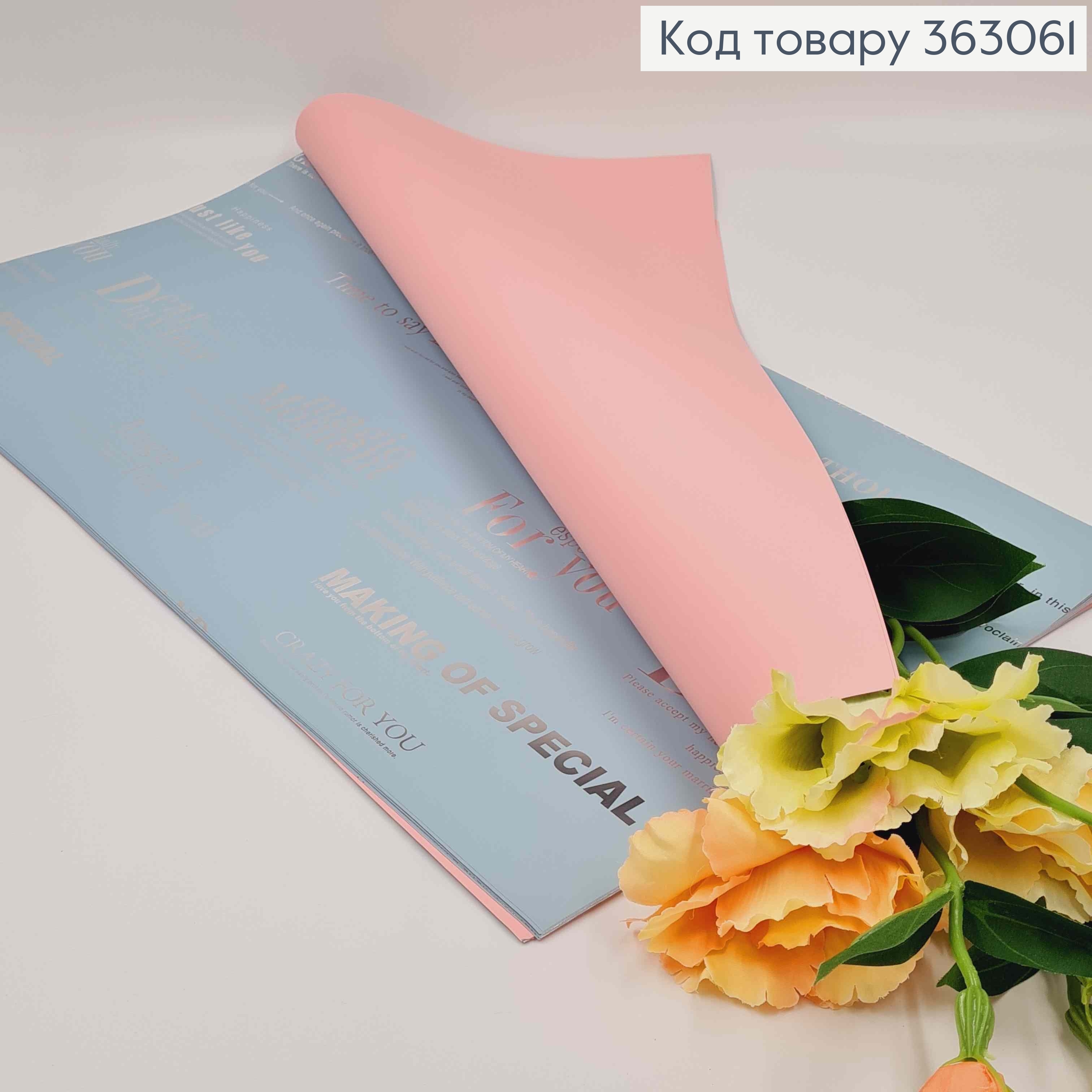 Пленка двухсторонняя СВЕТ-ГОЛУБЕВАЯ+НАПИСЫ/ РОЗОВЫЙ, в листах 58*58см, 60мкр