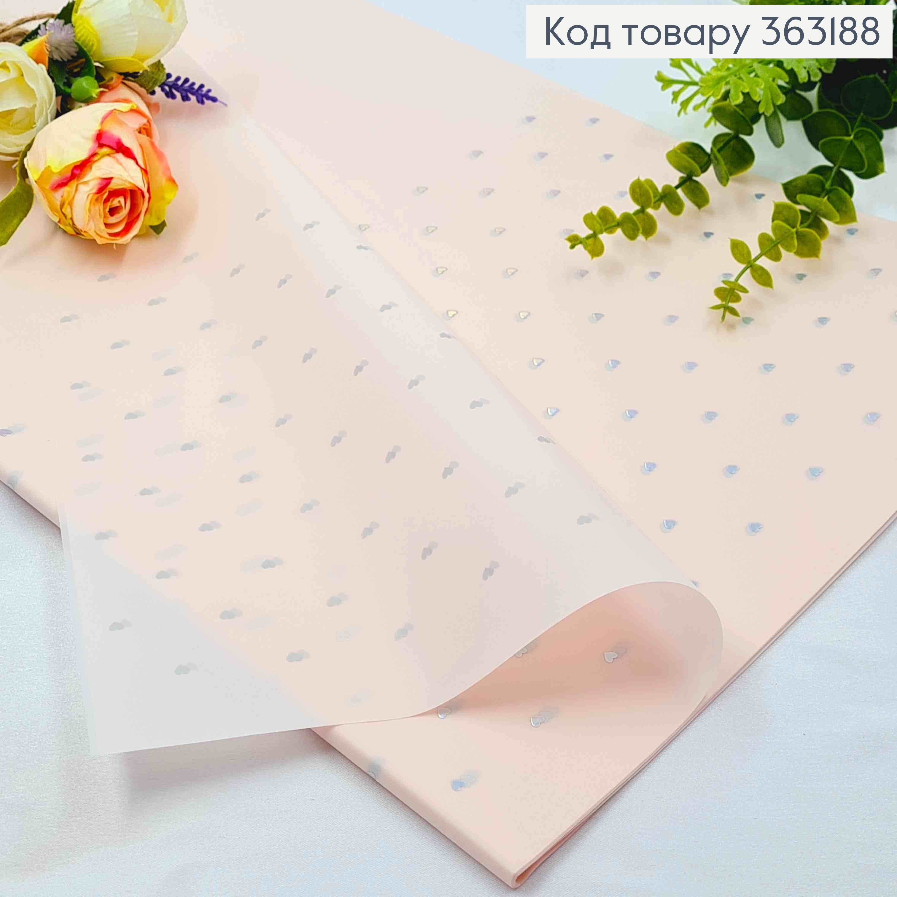 Пленка матовая НЕЖНО-РОЗОВАЯ с Серебряными Сердечками, в листьях 58*58см,70мкр