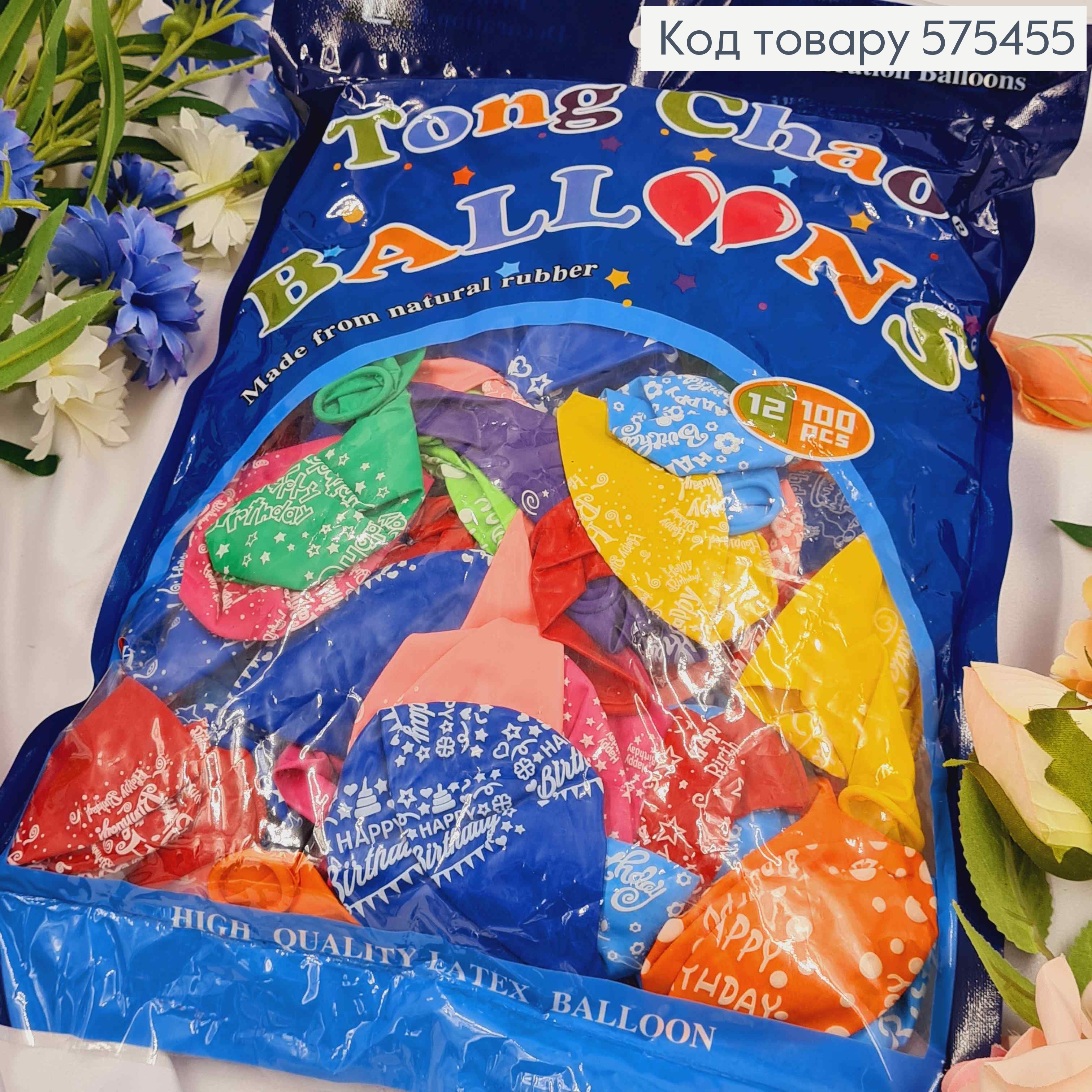 Воздушные шары латексные, 12' Tong Chao, Разноцветные с надписью "Happy Birthday", 100 шт/уп