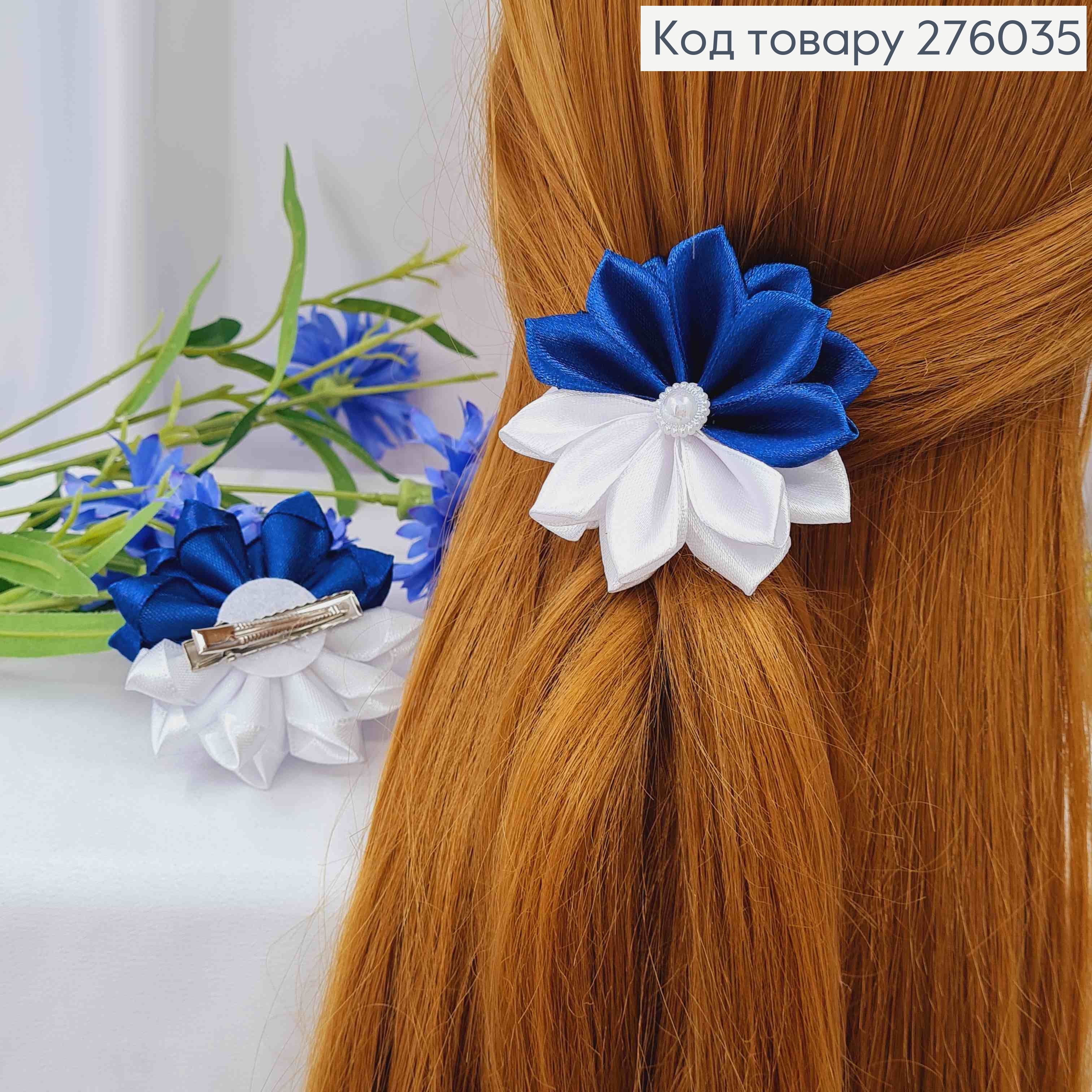 Заколка стрела атласный цветок "Хризантема", Бело-Синего цвета, 6см. ручная работа, Украина