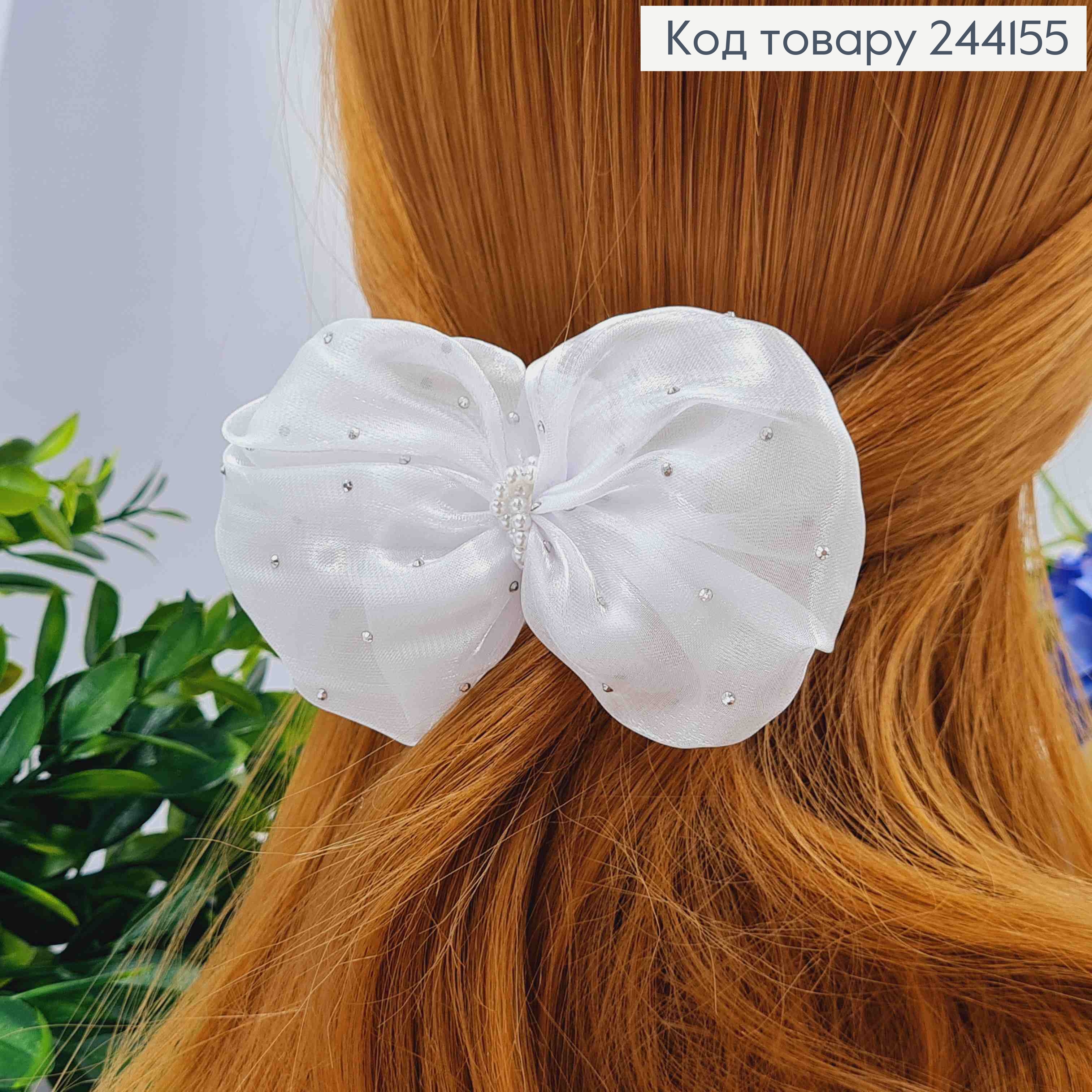 Бант БЕЛОГО цвета со стразами, на заколке 5,5, ткань атлас, размер 10*6,5см, Украина. 276163 фото