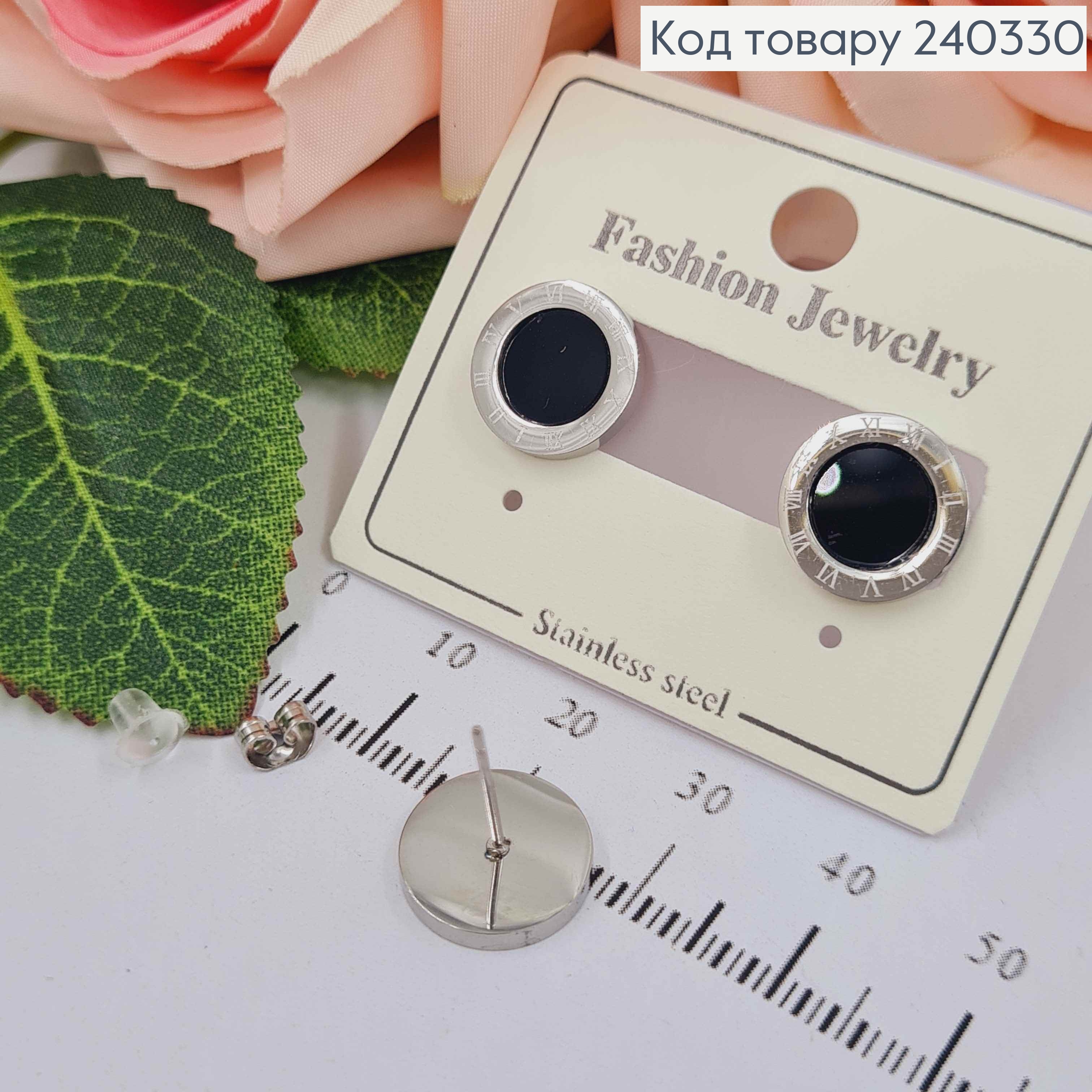 Серьги гвоздики, Римские часы, серебряный цвет с черной вставкой, Stainless Steel