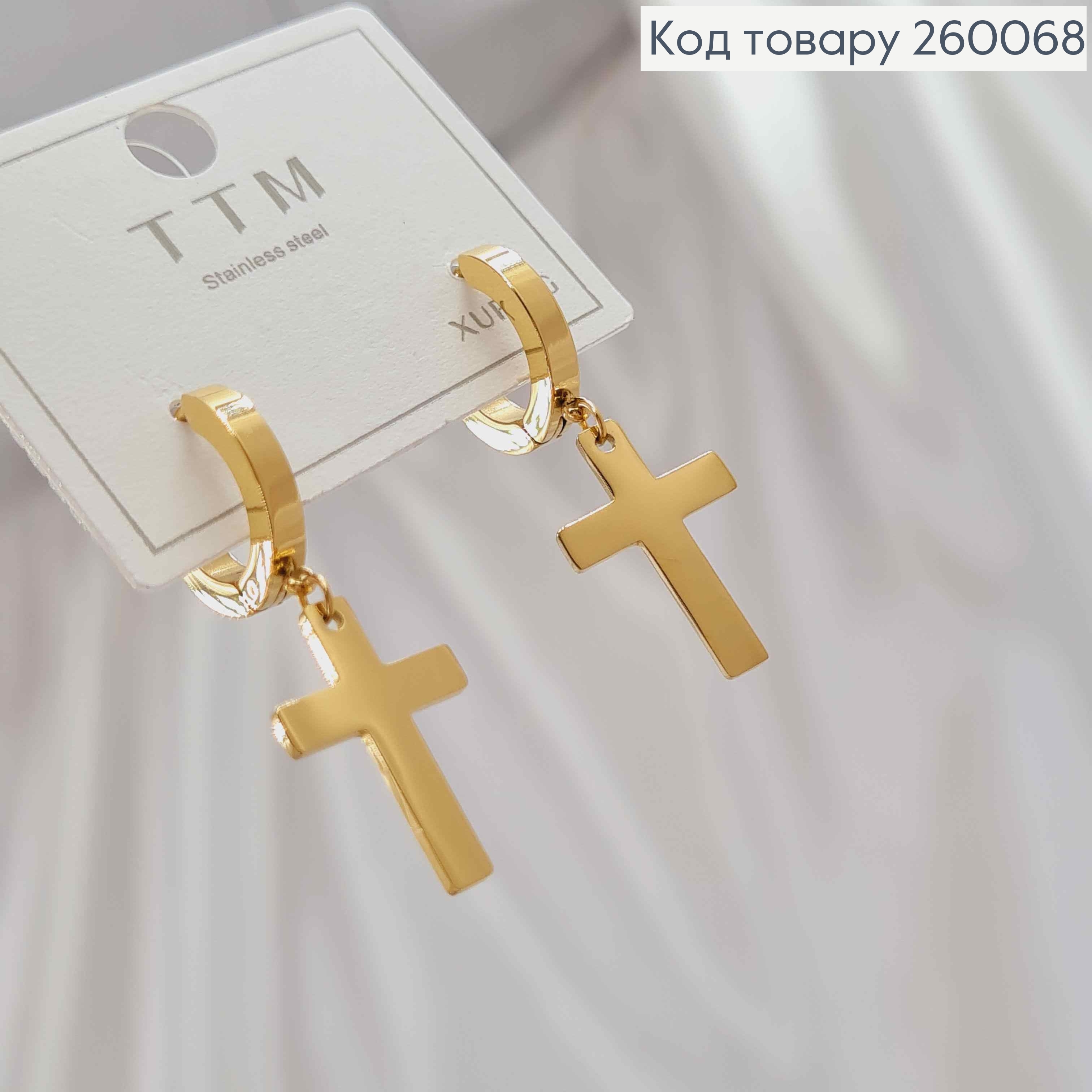 Серьги кольца 1,3см с подвеской Крест 1,1*1,7см, лимонного цвета, сталь Stainless Steel