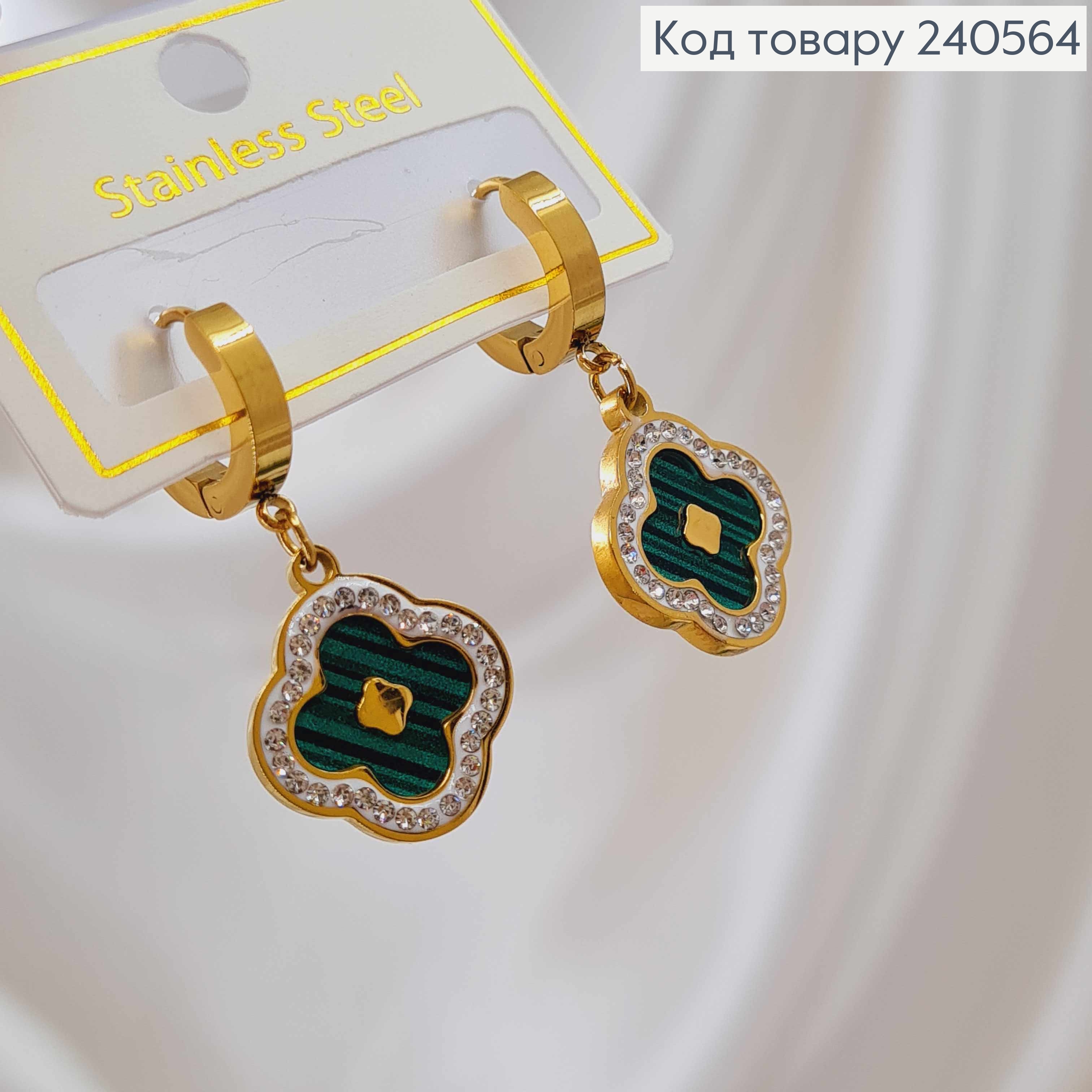 Серьги кольца, подвеска "Van Cleef" с зеленой эмалью, в камешках, 1,5см, лимонные, сталь Stainless Steel