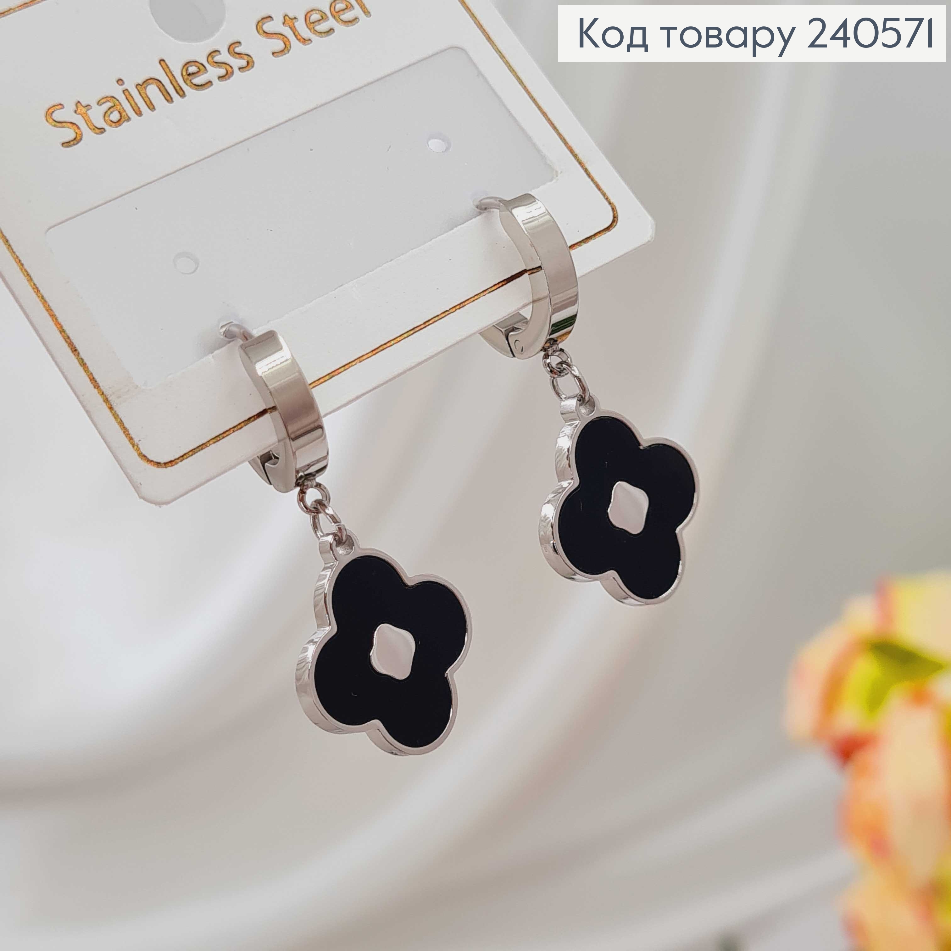 Серьги кольца, подвески Четырехлистники, с черной эмалью, 1,5см, серебряного цвета, сталь Stainless Steel
