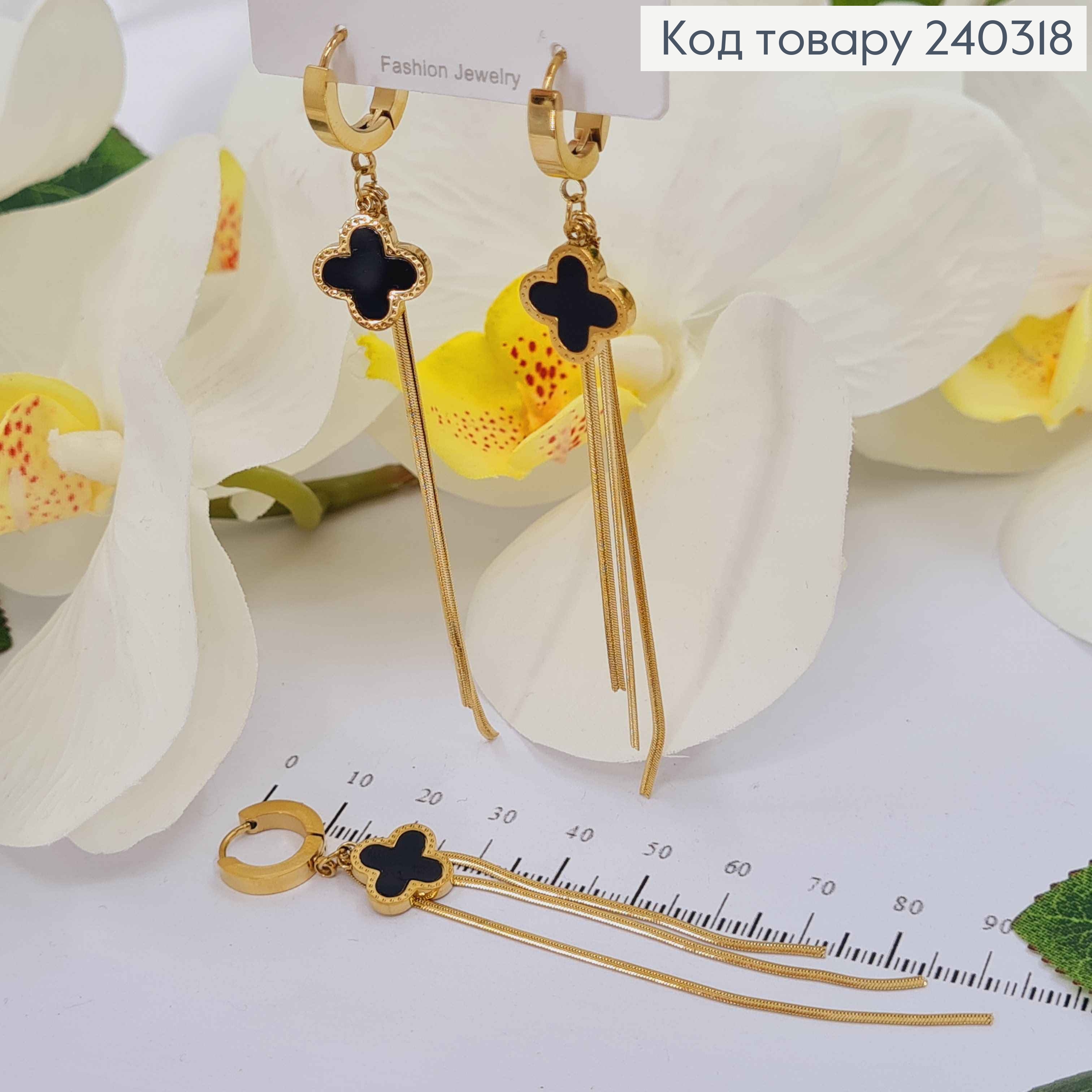 Серьги кольца, с подвеской четырёхлистниками черная эмаль и ниточками 6см, сталь Stainless Steel