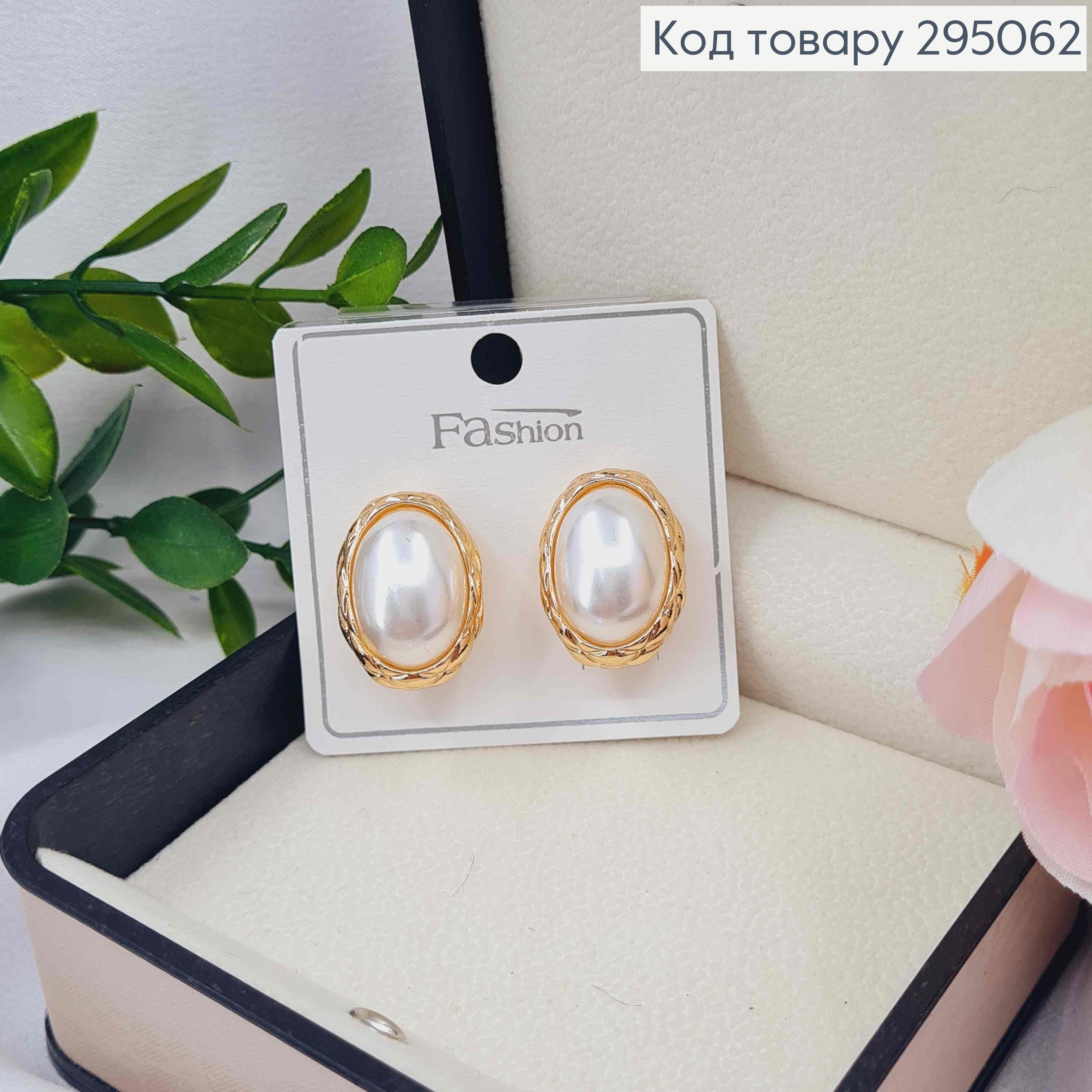 Серьги - Клипсы Овальная перламутровая бусина в оправе с тиснением, 2см, Золотого цвета 295135 фото