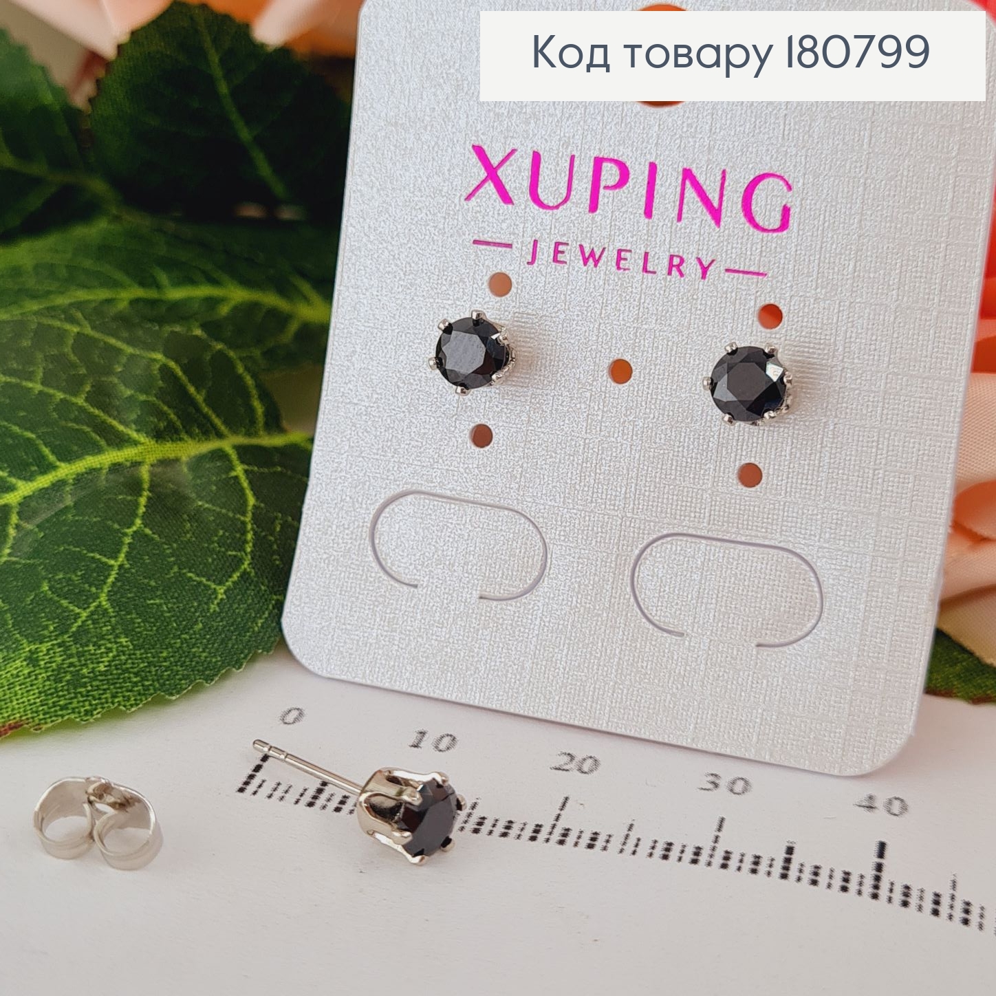 Сережки родированые гвоздики с чорным камнем 0,5см, Xuping