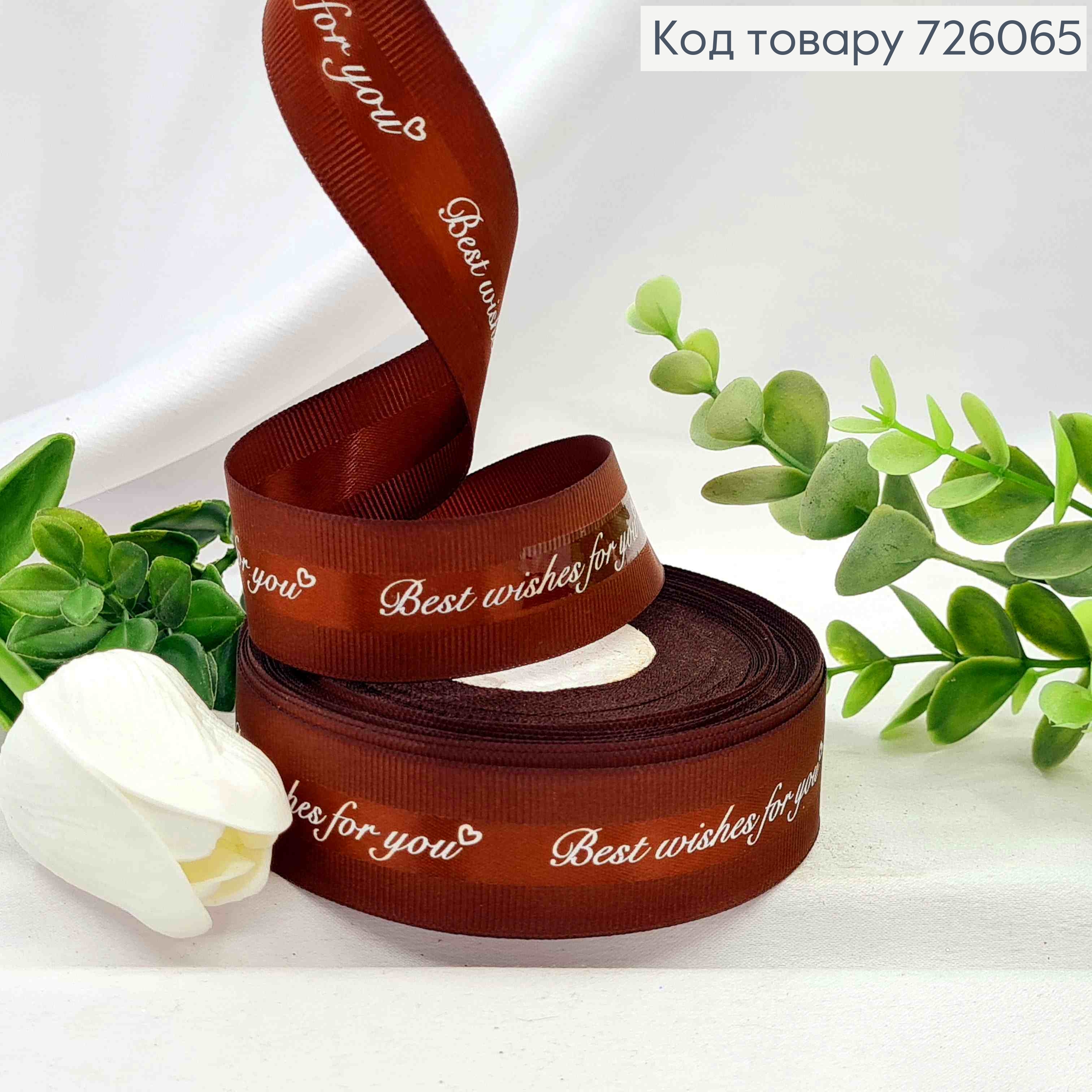 Лента-комбинированная, репсовая+атлас, КОРИЧНЕВАЯ "Best wishes for you", шир 2,5см, длина 25 ярдов (23м)