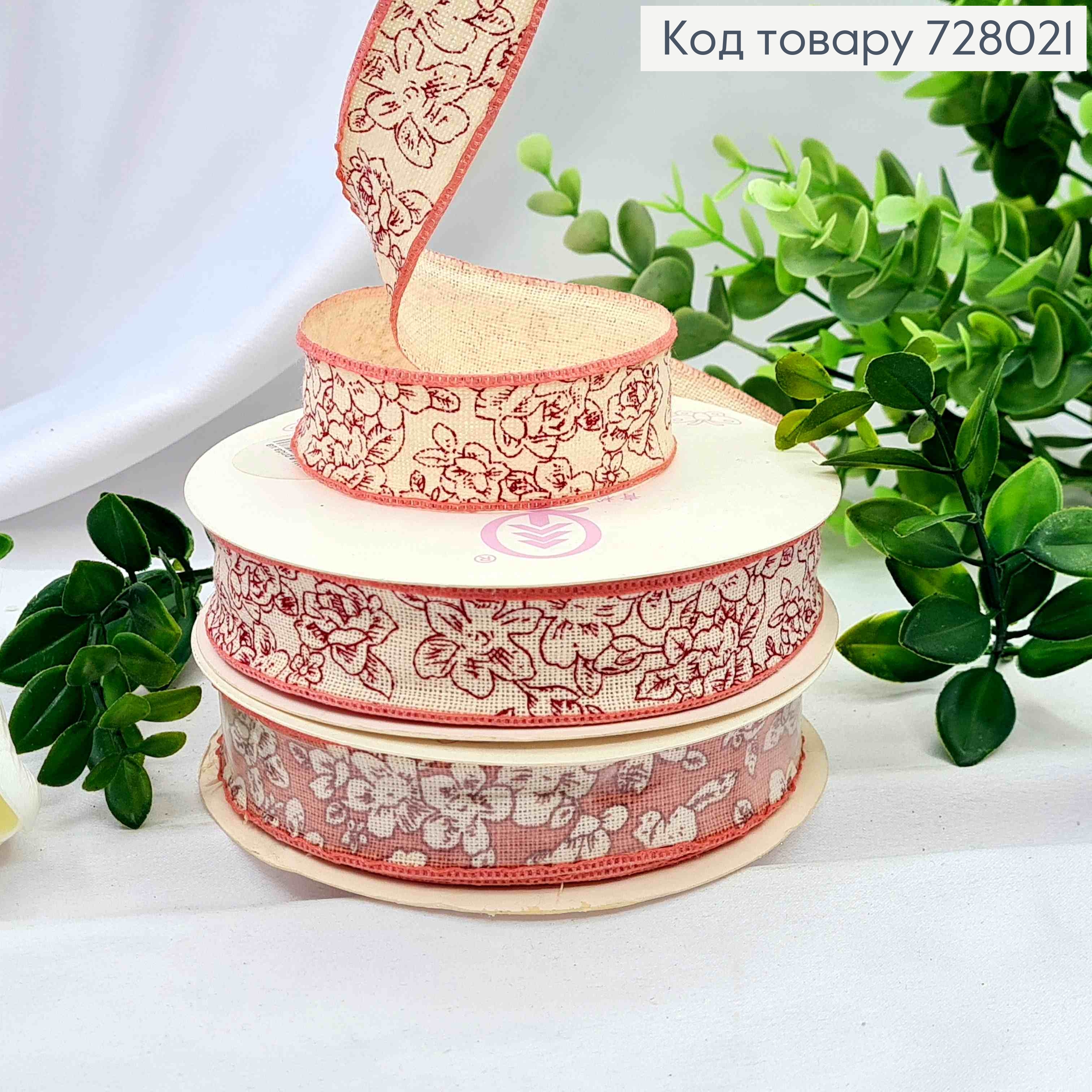 Лента-мешковина АИВОРИ/РОЗОВАЯ с принтом ЦВЕТЫ, ширина 2,5см, длина 20 ярдов (18м)
