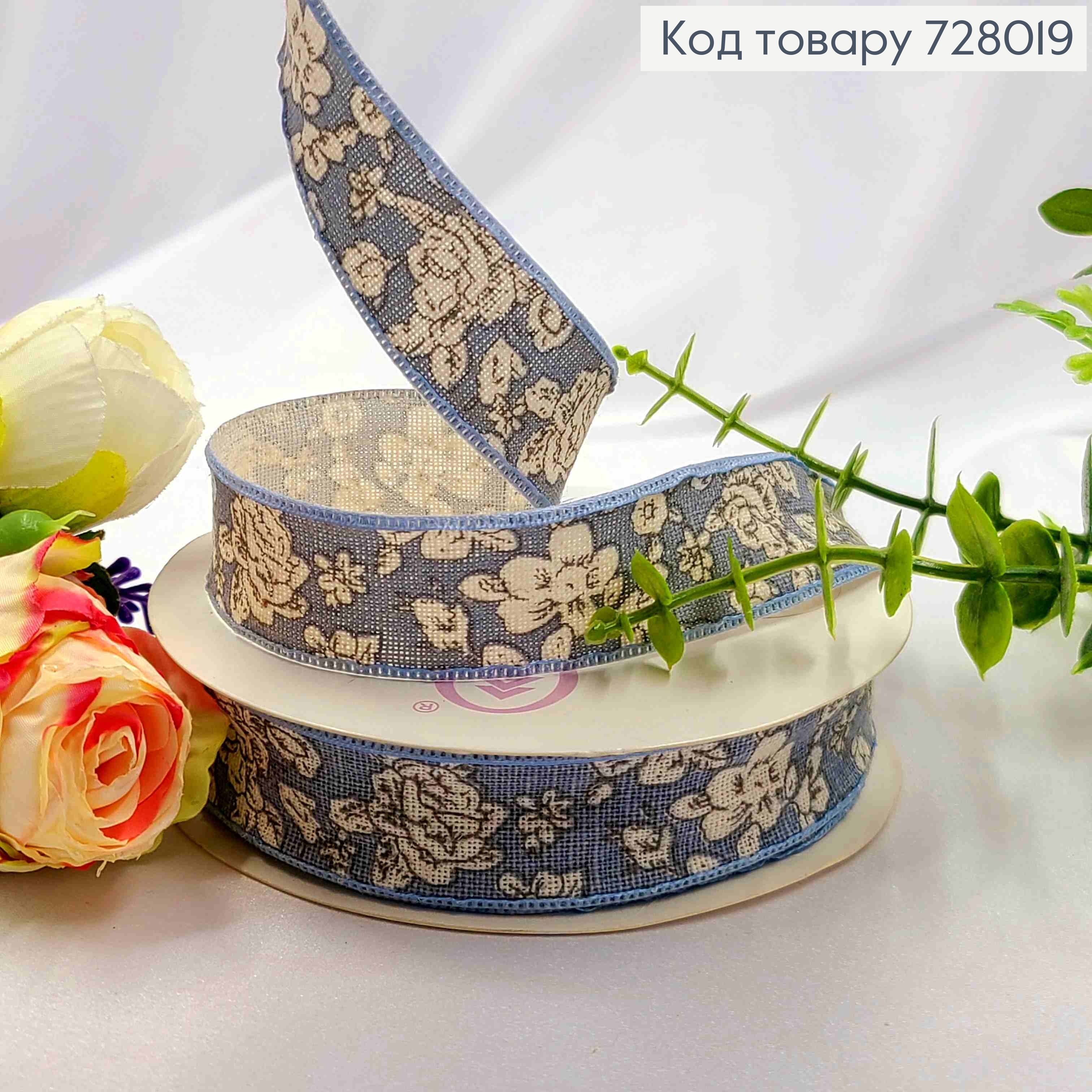 Лента-мешковина ГОЛУБАЯ с принтом ЦВЕТЫ, ширина 2,5см, длина 20 ярдов (18м)