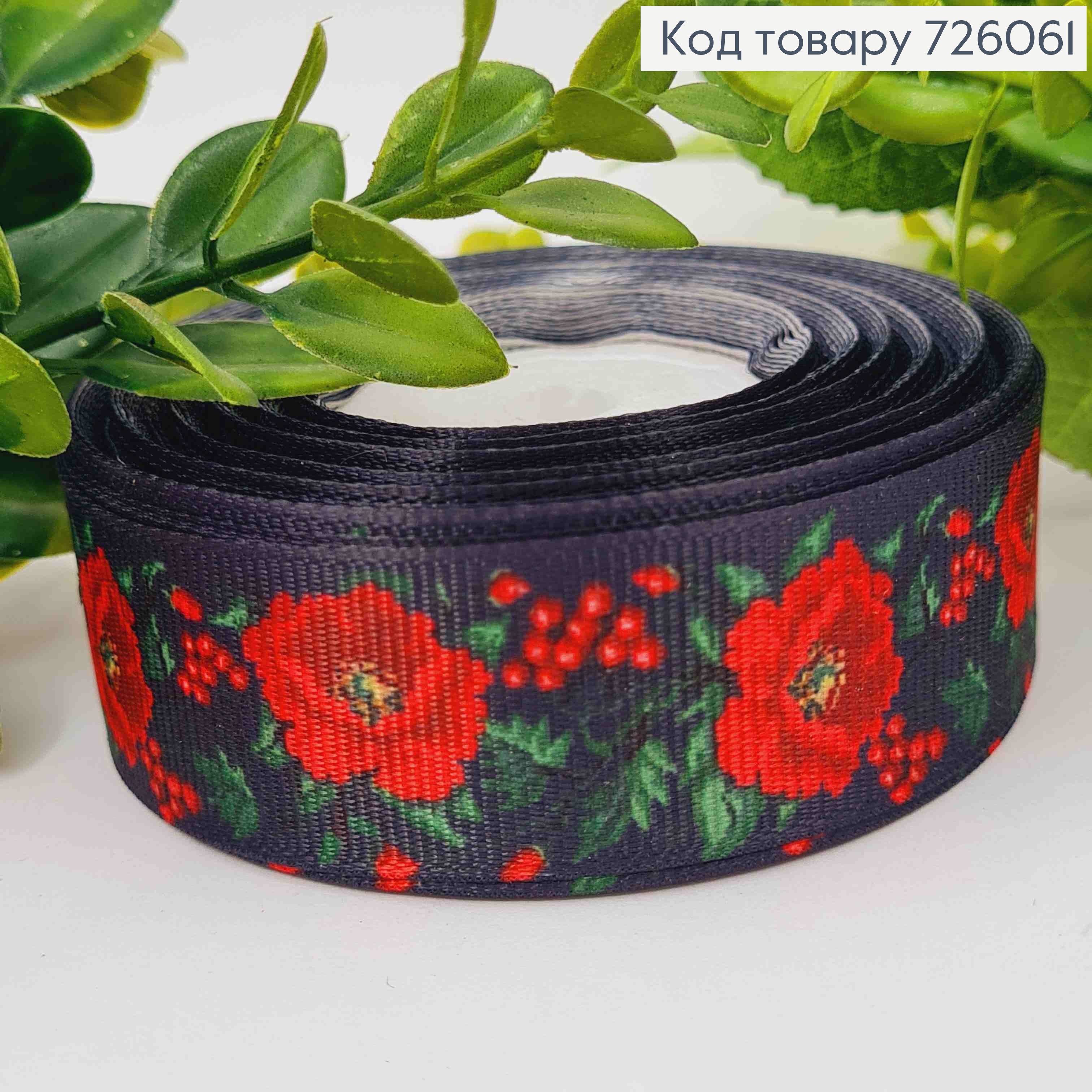 Лента репсовая, ЧЕРНАЯ с принтом "Красный Цветок с Калиной", ширина 4см, длина 25 ярдов (23м) 726064 фото