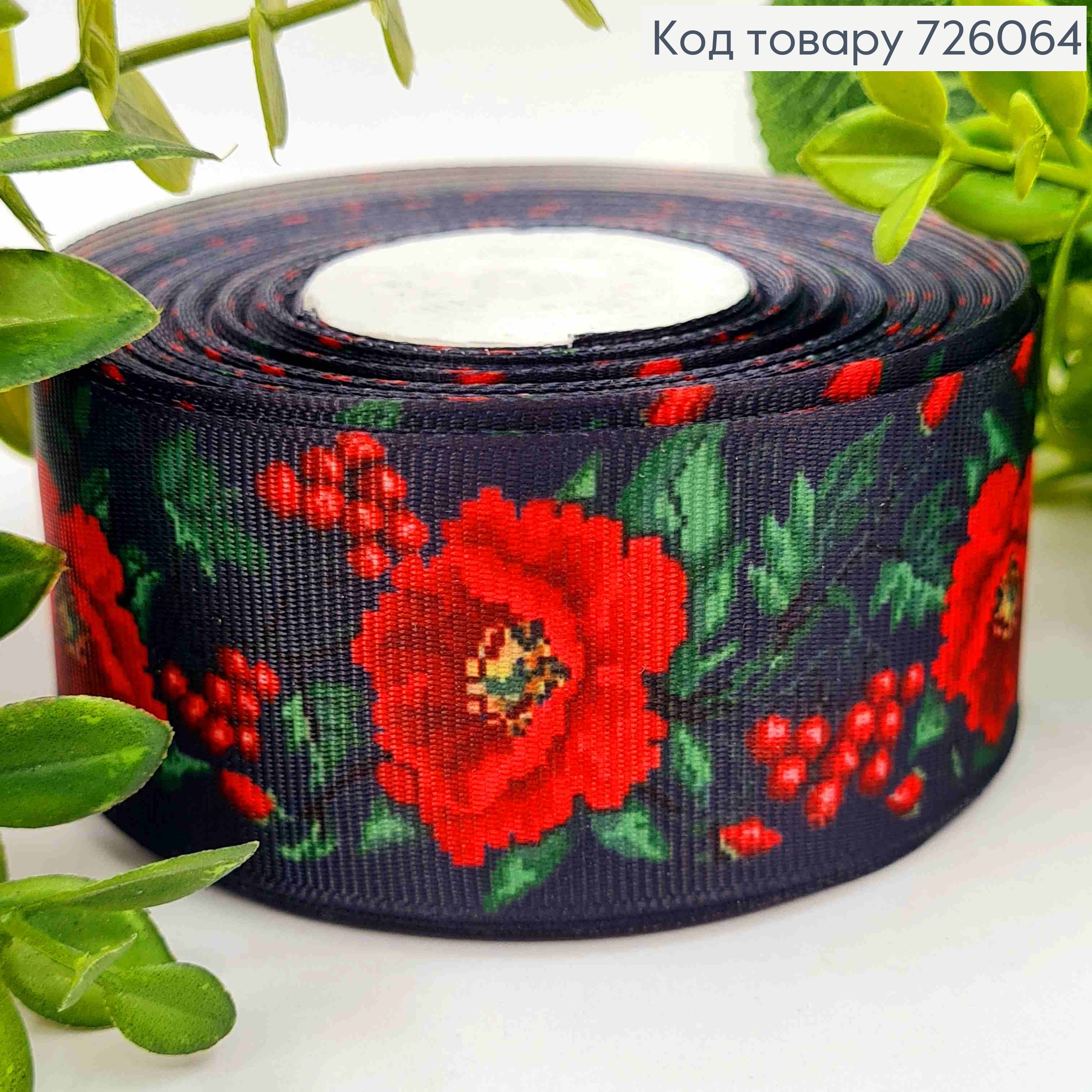 Лента репсовая, ЧЕРНАЯ с принтом "Красный Цветок с Калиной", ширина 4см, длина 25 ярдов (23м)