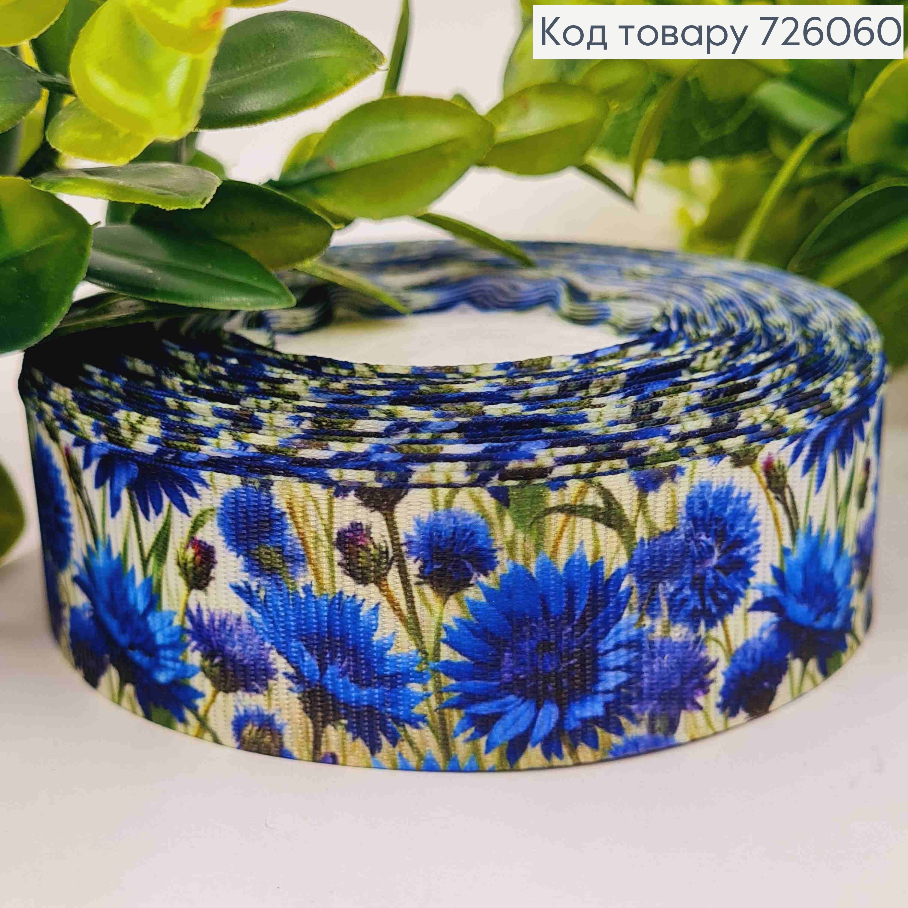 Лента репсовая, с принтом "Синие Васильки", ширина 2,5см, длина 25 ярдов (23м)