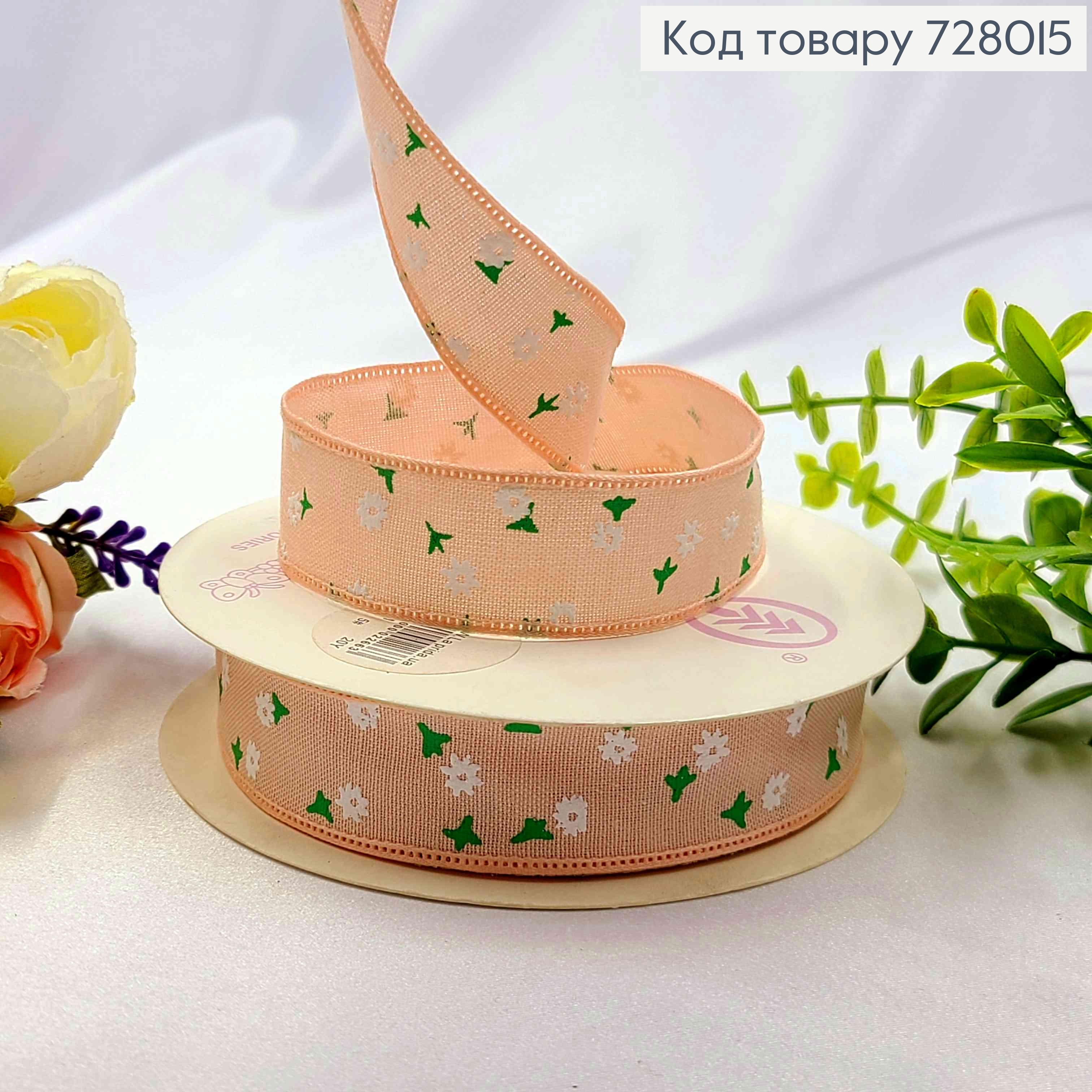 Лента тканевая БЛЕДО-ПЕРСИКОВАЯ с принтом ЦВЕТОЧКИ, ширина 2,5см, длина 20 ярдов (18м)