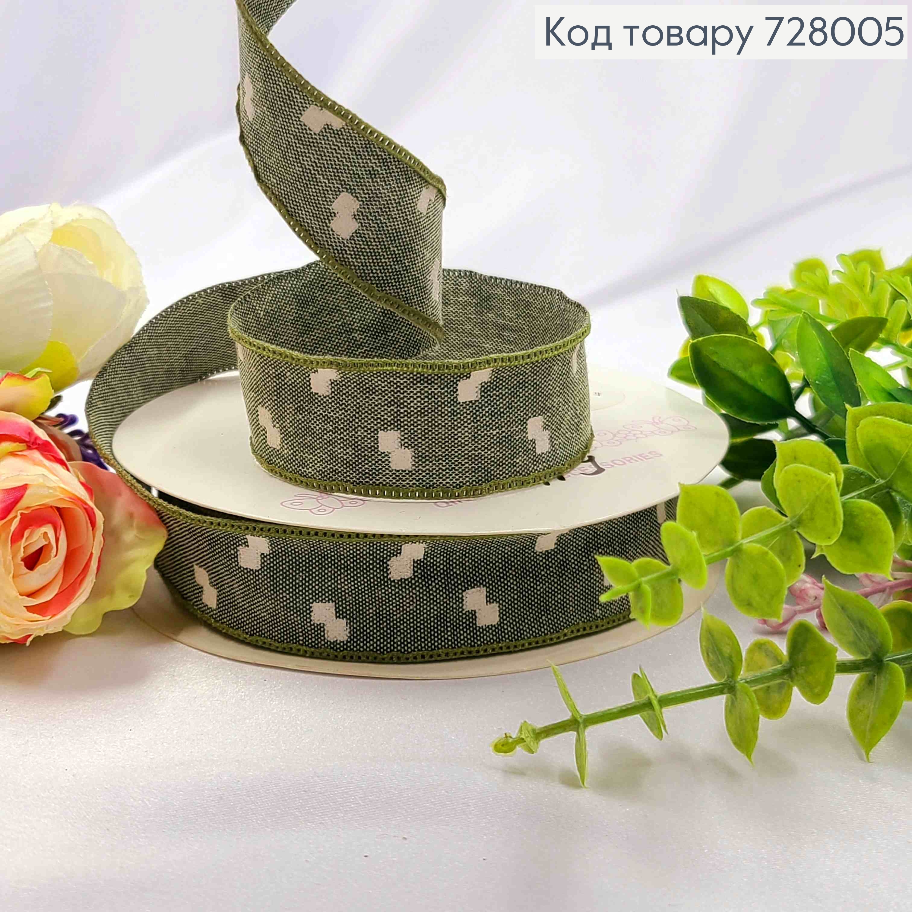Лента тканевая цвета ХАКИ с принтом КВАДРАТИК, ширина 2,5см, длина 20 ярдов (18м)