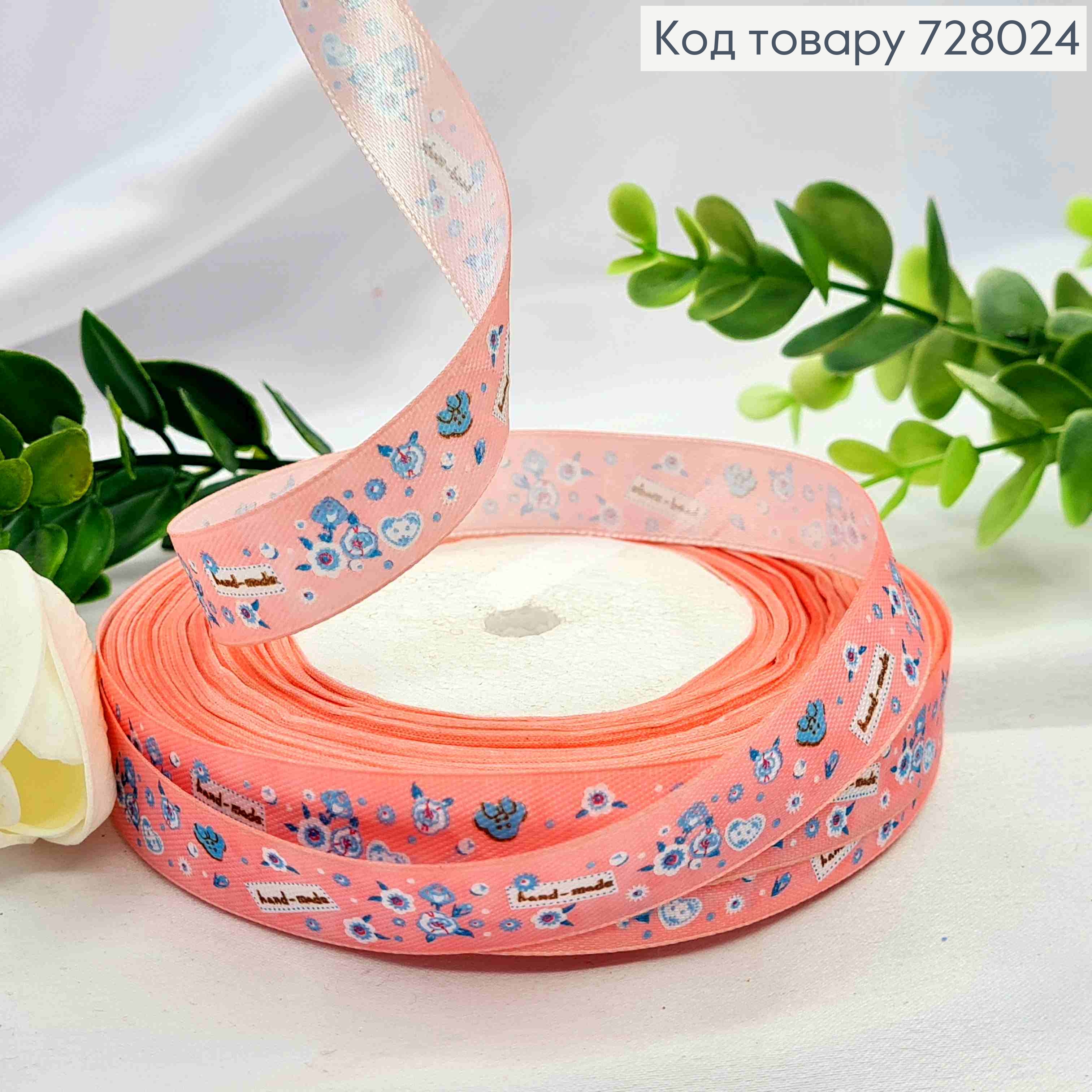 Лента тканевая, Светло-Розовая с принтом "Цветы", ширина 1,5см, длина 20 ярдов (18м)