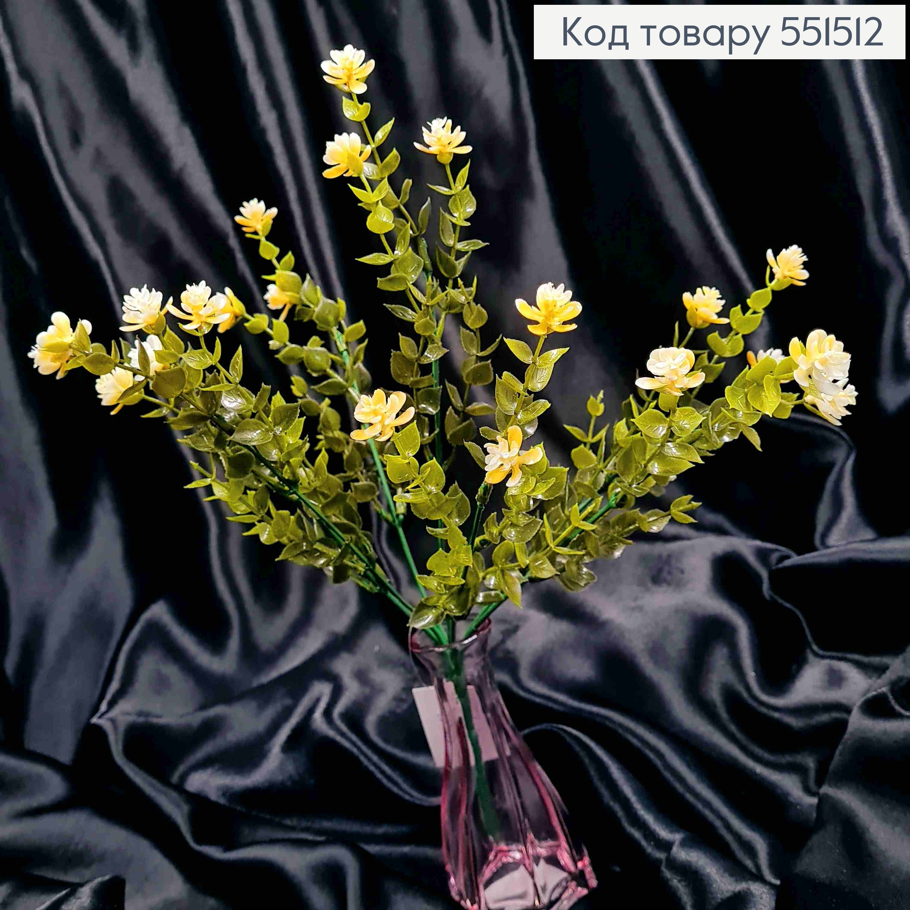 Искусственная декоративная зелень Самшит, с бело-желтыми цветочками, 7 веточек на металлическом стержне, 35см.