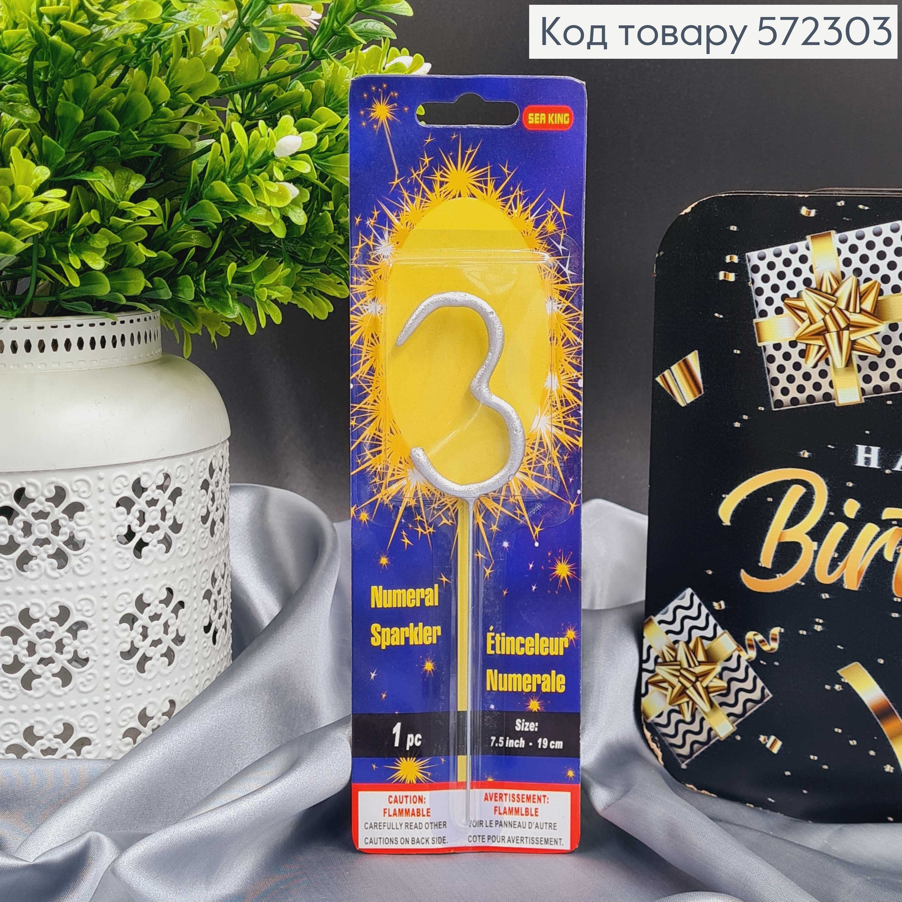 Свечка в торт цифра "3", Серебро Бенгальский огонь, 6,5+10см