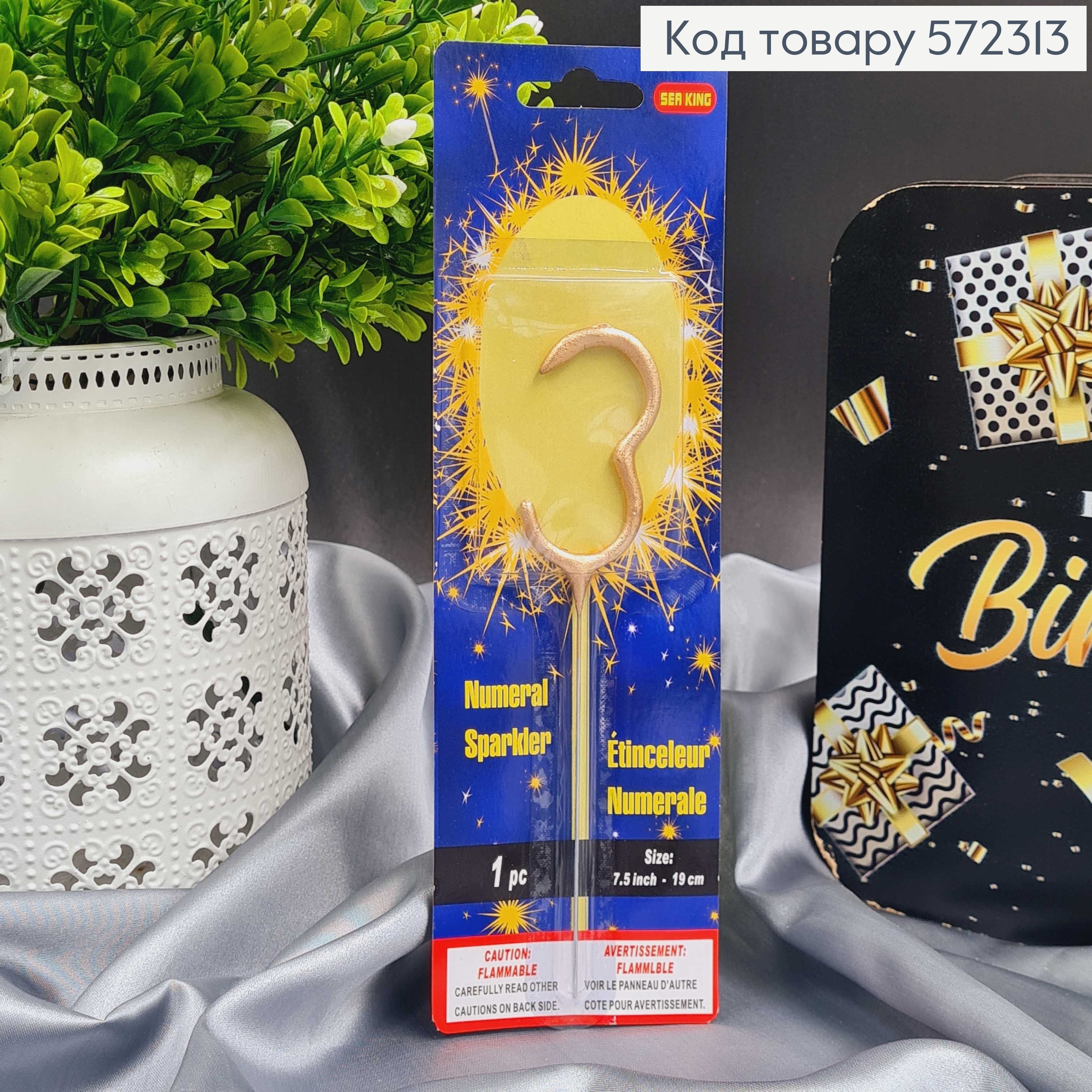 Свечка в торт цифра "3", Золото Бенгальский огонь, 6,5+10см