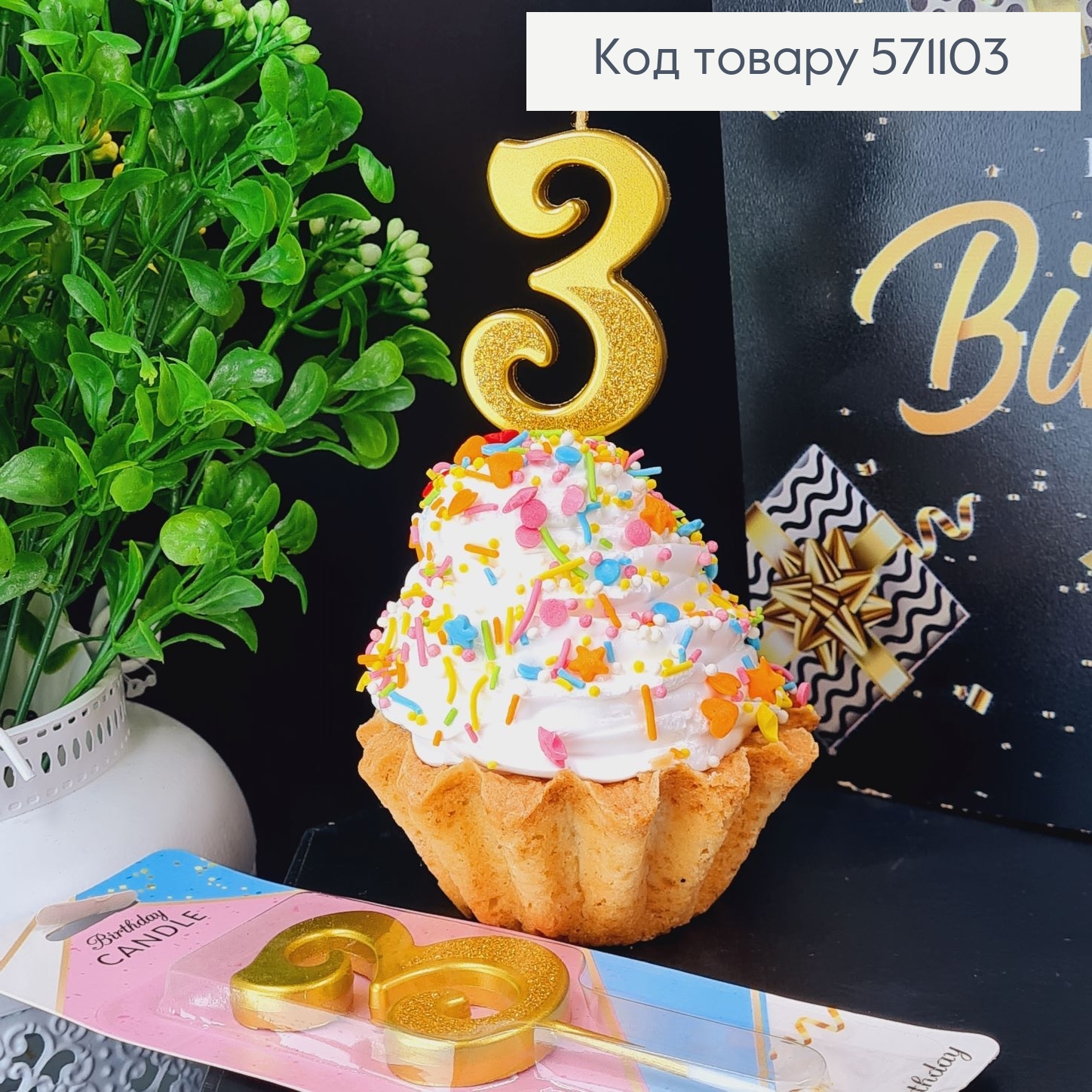 Свечка в торт цифра "3", Золото с блеском, 5+4см