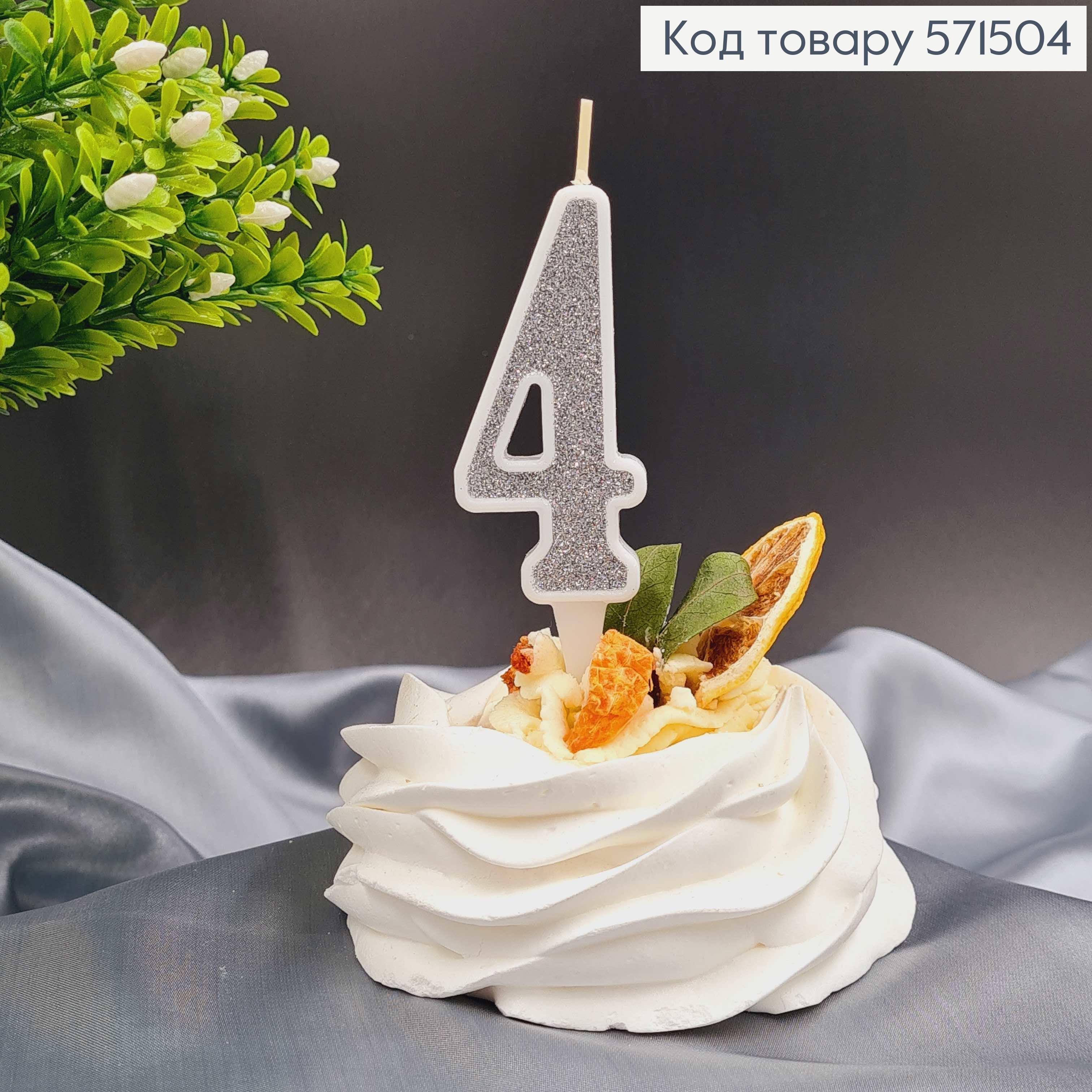 Свечка в торт цифра "4", Серебро глитер, 7+2см, Украина