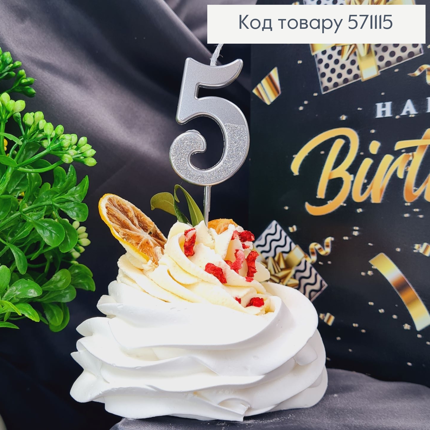Свечка в торт цифра "5", Серебро с блеском, 5+4см
