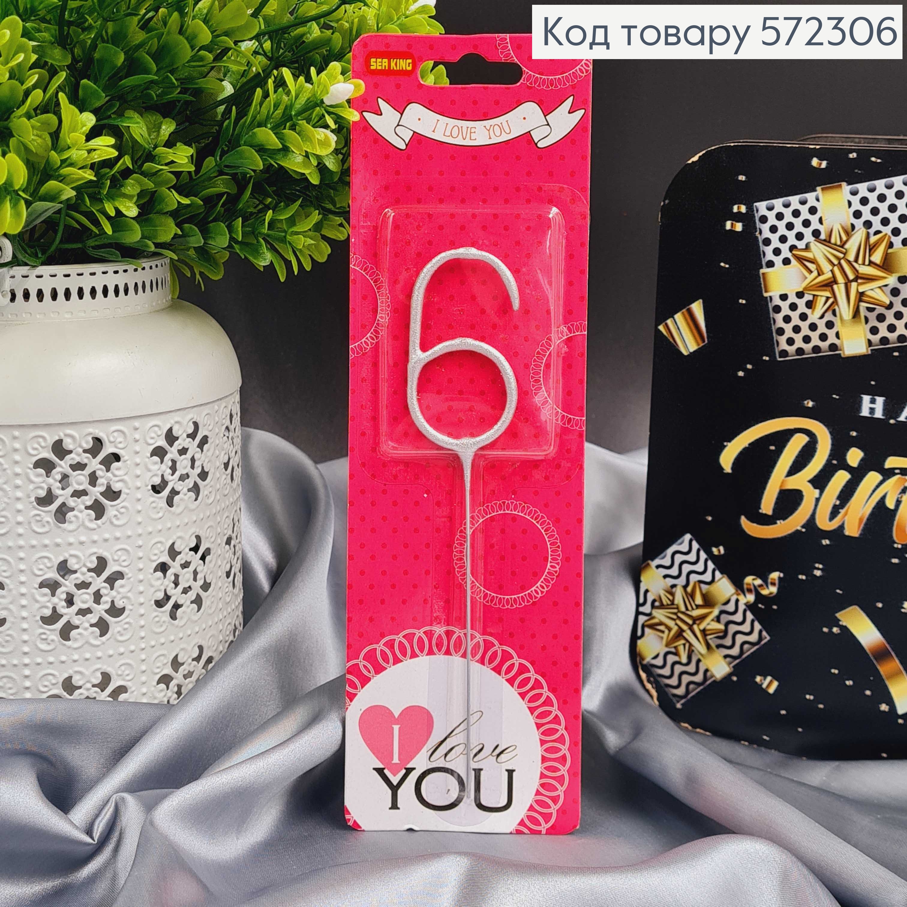 Свечка в торт цифра "6", Серебро Бенгальский огонь, 6,5+10см