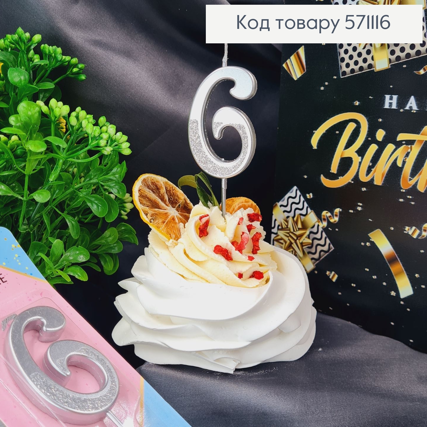 Свечка в торт цифра "6", Серебро с блеском, 5+4см