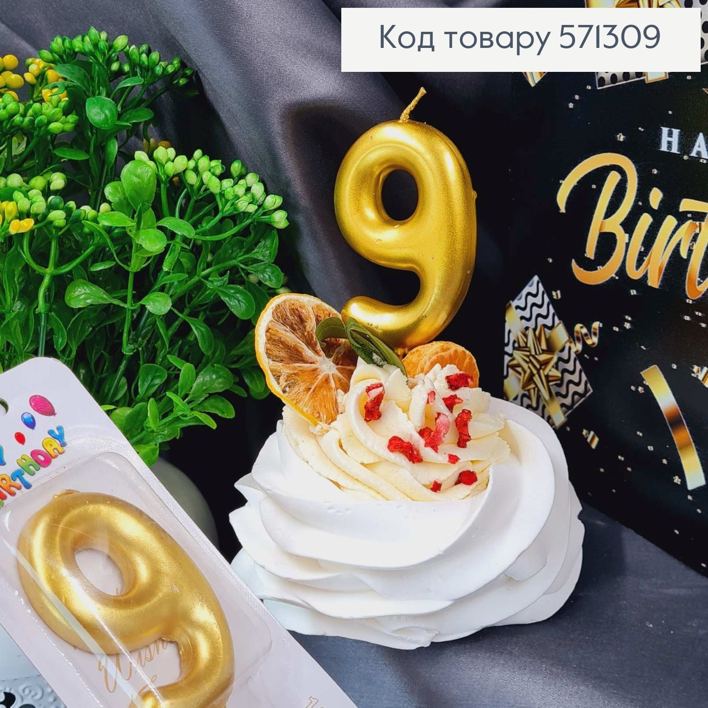 Свечка в торт цифра "9", Хромированая Золото, 5,5+4см, Украина 572609 фото