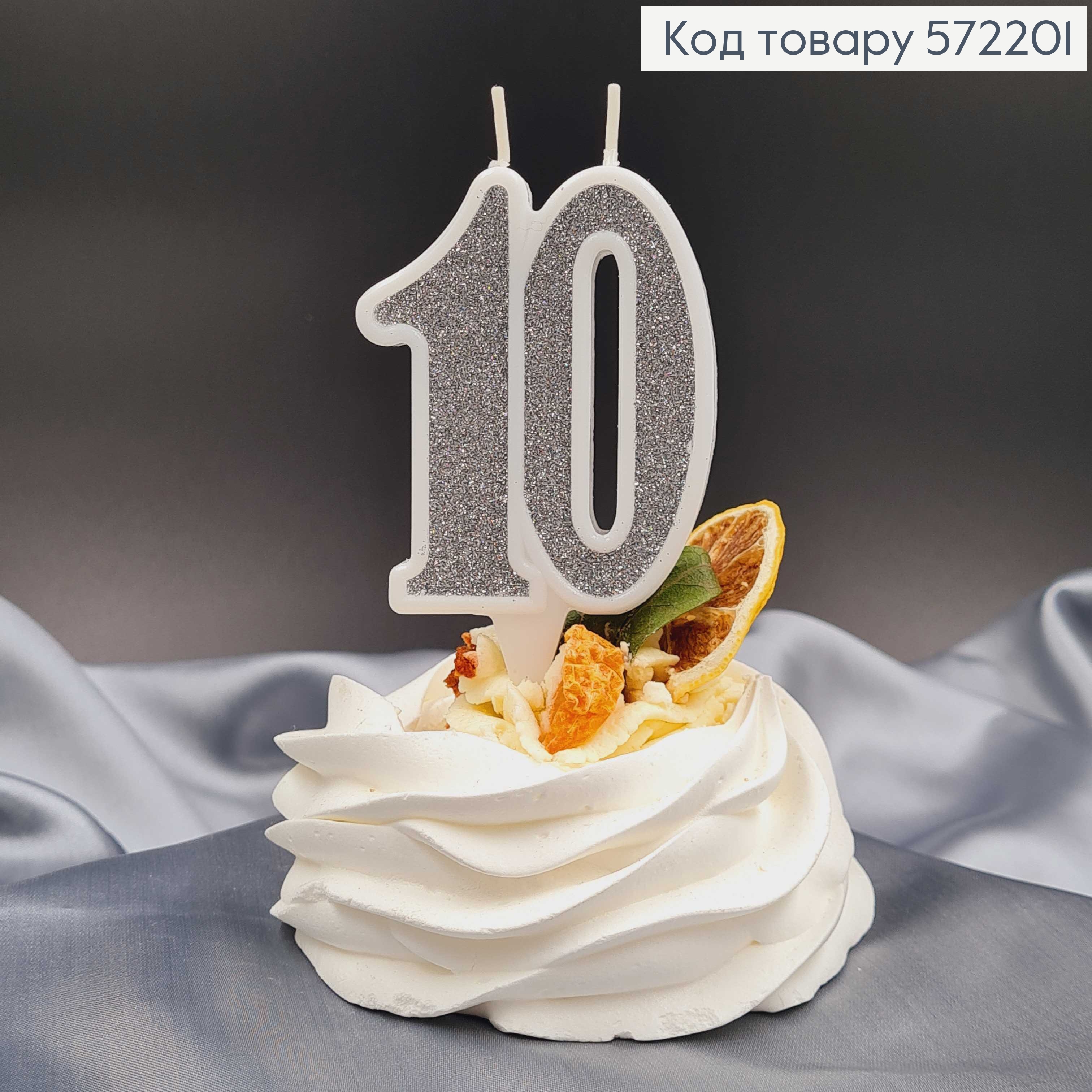 Свечка в торт юбилейная "10", Серебро глитер, 7,5+1,5см, Украина
