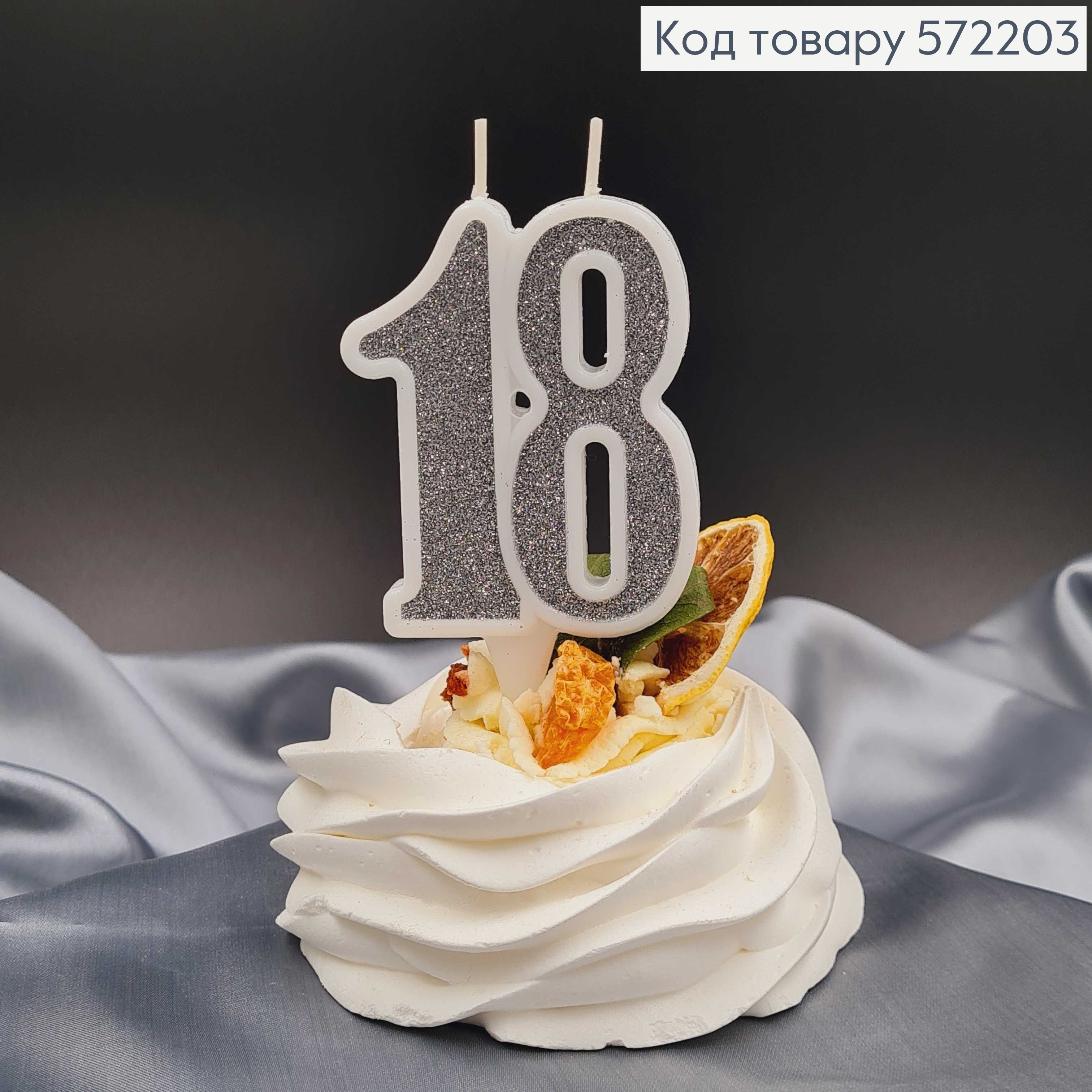 Свечка в торт юбилейная "18", Серебро глитер, 7,5+1,5см, Украина
