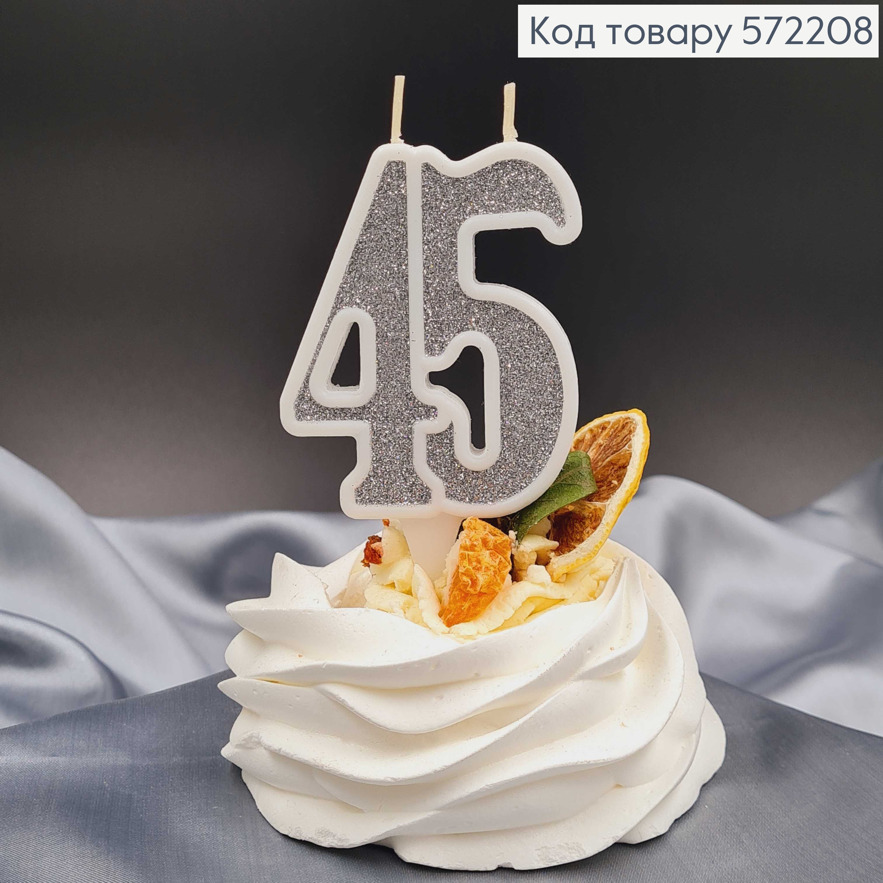 Свечка в торт юбилейная "45", Серебро глитер, 7,5+1,5см, Украина