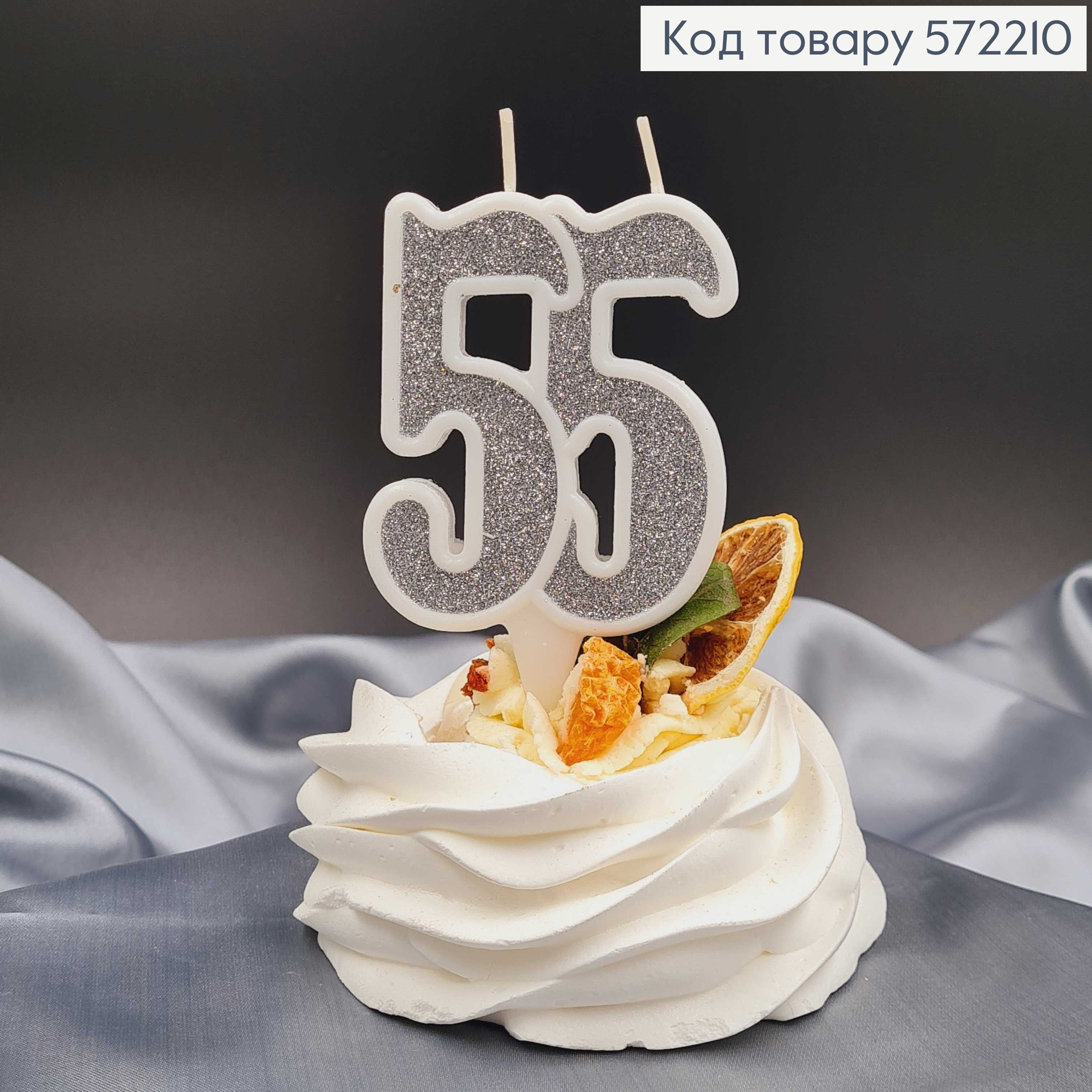 Свечка в торт юбилейная "55", Серебро глитер, 7,5+1,5см, Украина